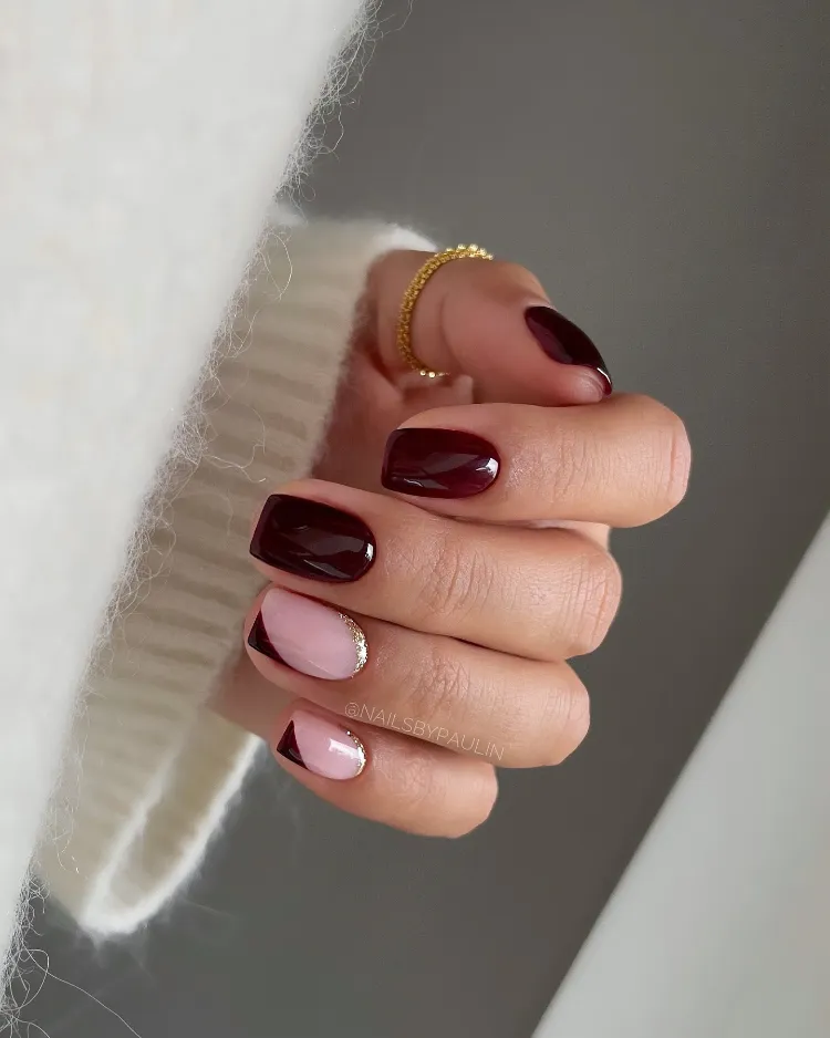 For those who prefer shorter nails, this set proves burgundy can still look luxurious. Paired with delicate nude bases and glittery gold accents, it’s a classy and practical manicure for both work and special nights out.