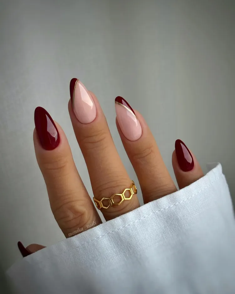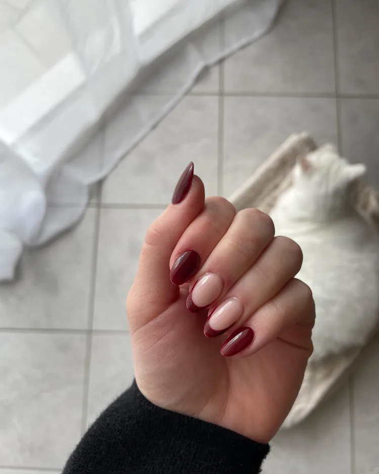 A timeless combo, these nails pair rich burgundy with a natural nude base. The oval shape and glossy finish keep things elegant yet wearable, making them perfect for fall outfits, holiday dinners, or casual chic days.