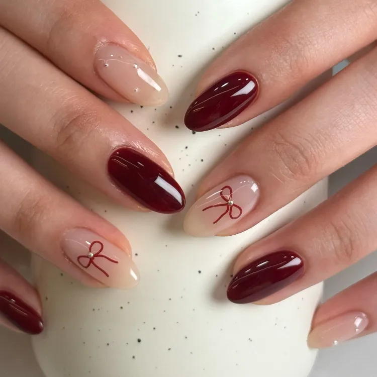 Chic and feminine, this set combines glossy burgundy with nude bases accented by tiny bow details. It’s a cute yet sophisticated design that feels especially fitting for the holidays or romantic evenings.
