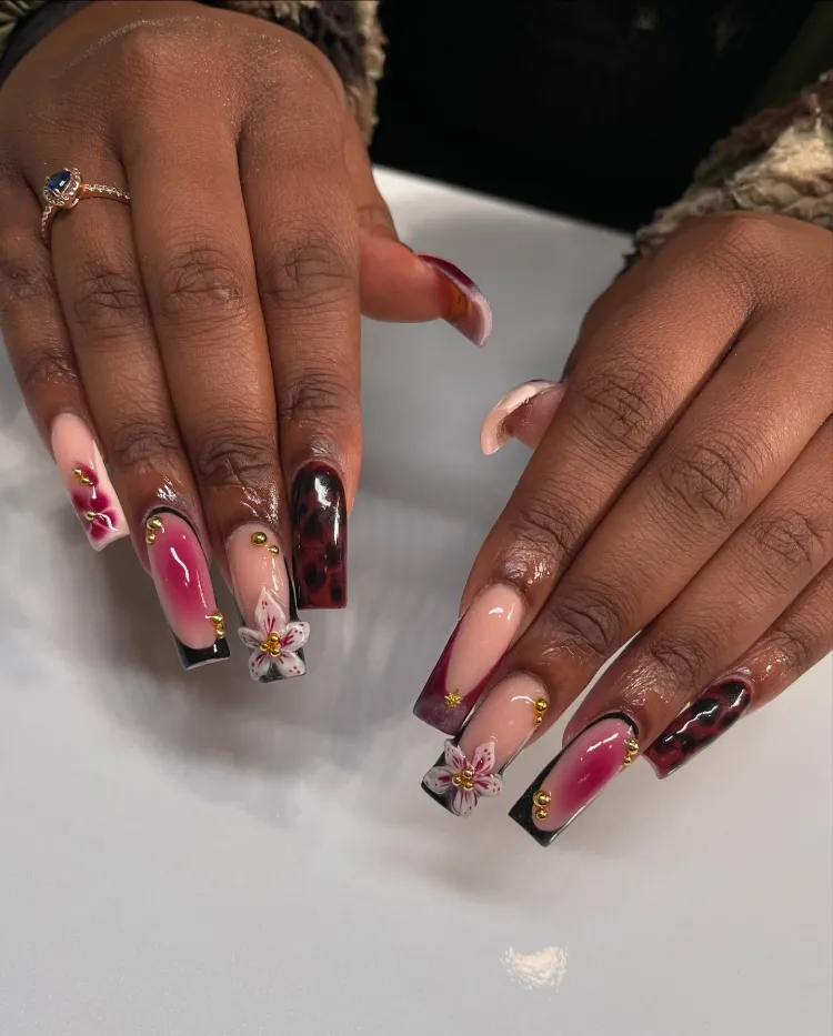 If you’re ready to make a statement, these nails combine rich burgundy with bold 3D flower accents. Touches of gold and leopard details add luxury and edge. They’re the perfect mix of feminine charm and daring creativity—ideal for special occasions.