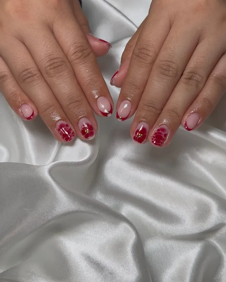 Playful yet elegant, this manicure mixes burgundy tips with delicate floral accents. The short length makes them easy to wear daily, while the unique detailing ensures your nails will always get noticed in the best way.