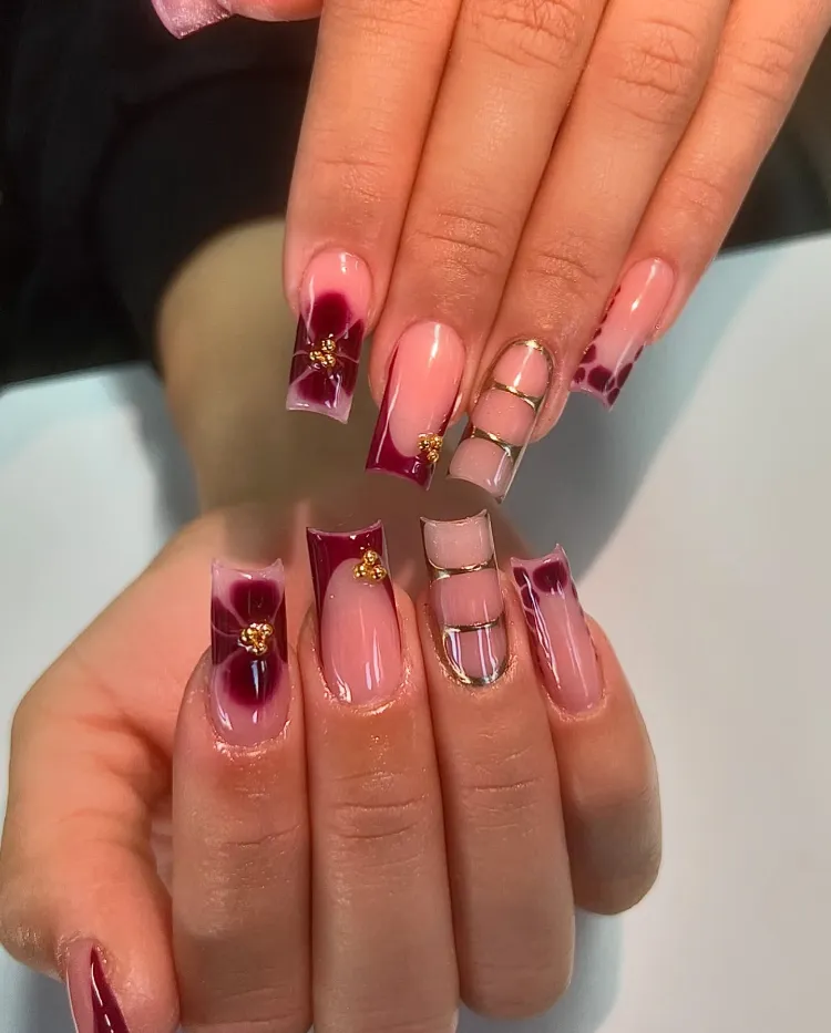 These nails feature soft nude bases with striking burgundy floral effects and gold detailing. The combination feels delicate yet dramatic, making it a gorgeous style for fall weddings, romantic dates, or just when you want your nails to feel extra special.