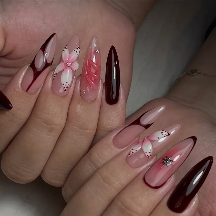This set is all about romance with its 3D flower accents against glossy burgundy tips. Paired with intricate pink and red details, these nails create a soft yet powerful look—ideal for weddings, dates, or simply feeling fabulous.
