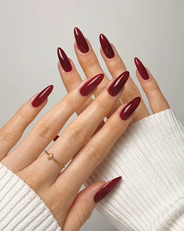 For those who love sharp, statement nails, this glossy stiletto set delivers. The deep burgundy shade feels both classy and daring, making it a perfect choice when you want your manicure to make a lasting impression.