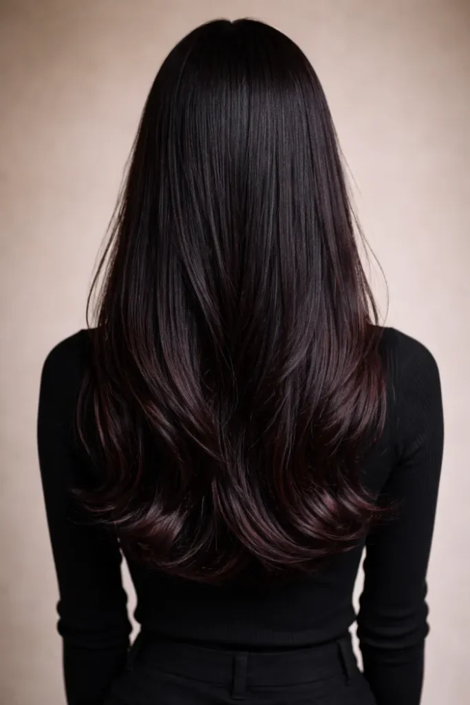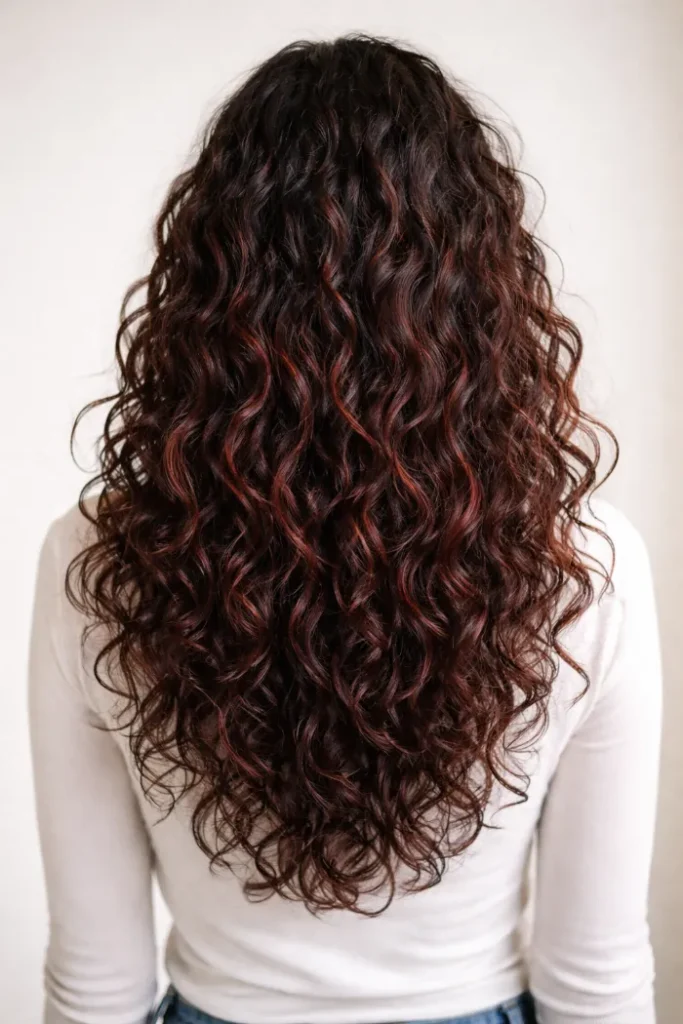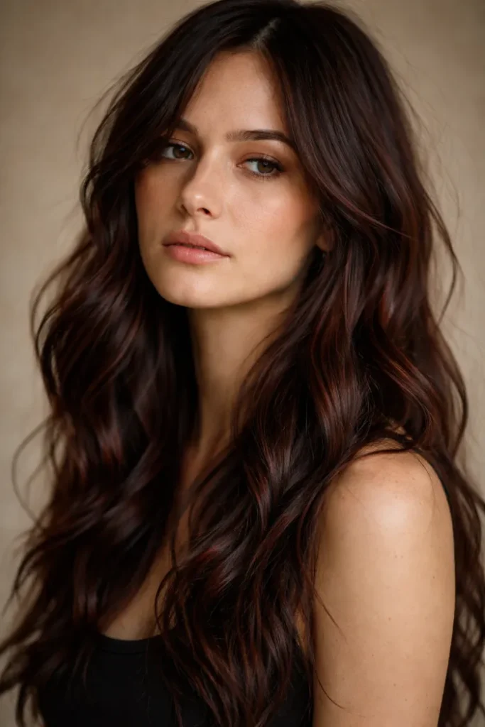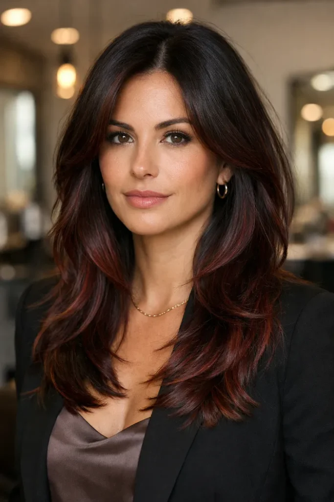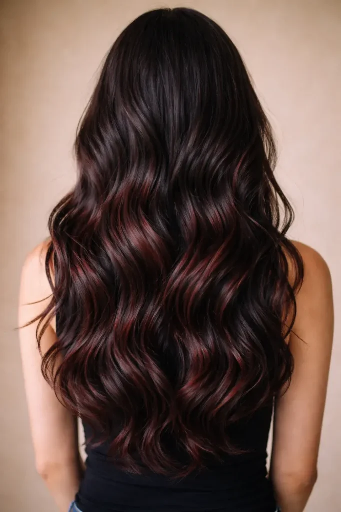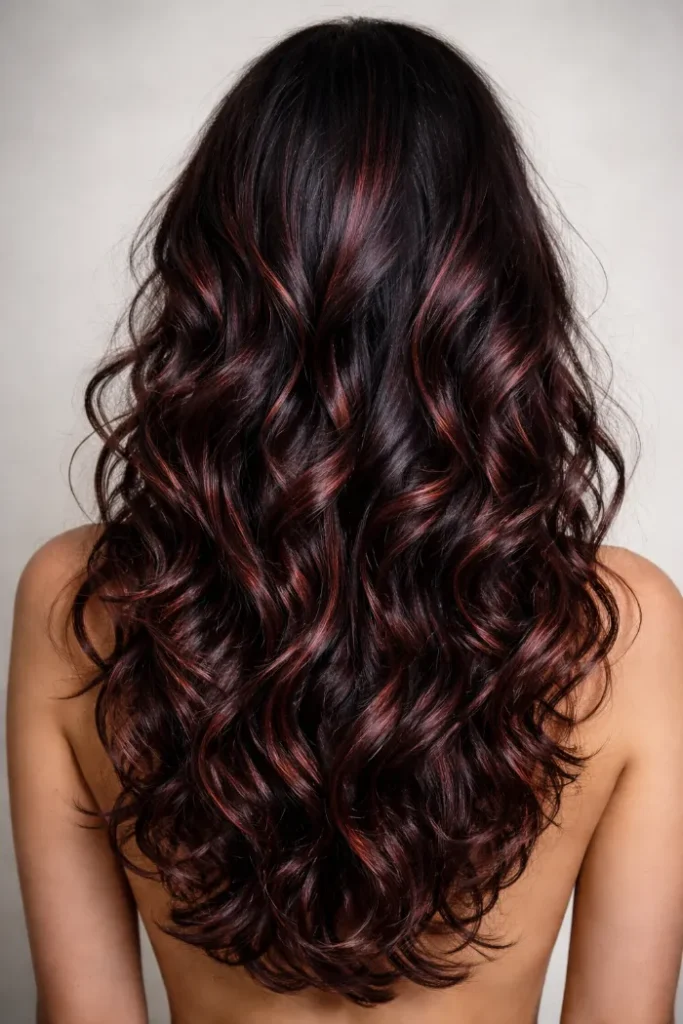 This one is all about a smooth blend, with cherry tones melting into the darker base. The long layers keep it light and bouncy. If your hair holds heat well, big loose curls make the color look even deeper and more expensive.