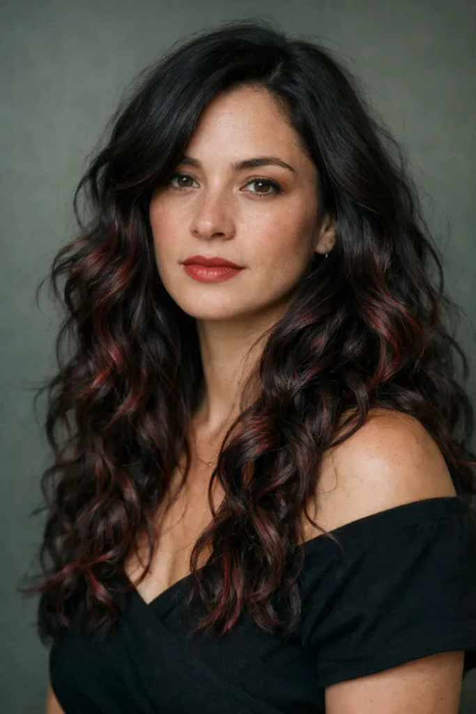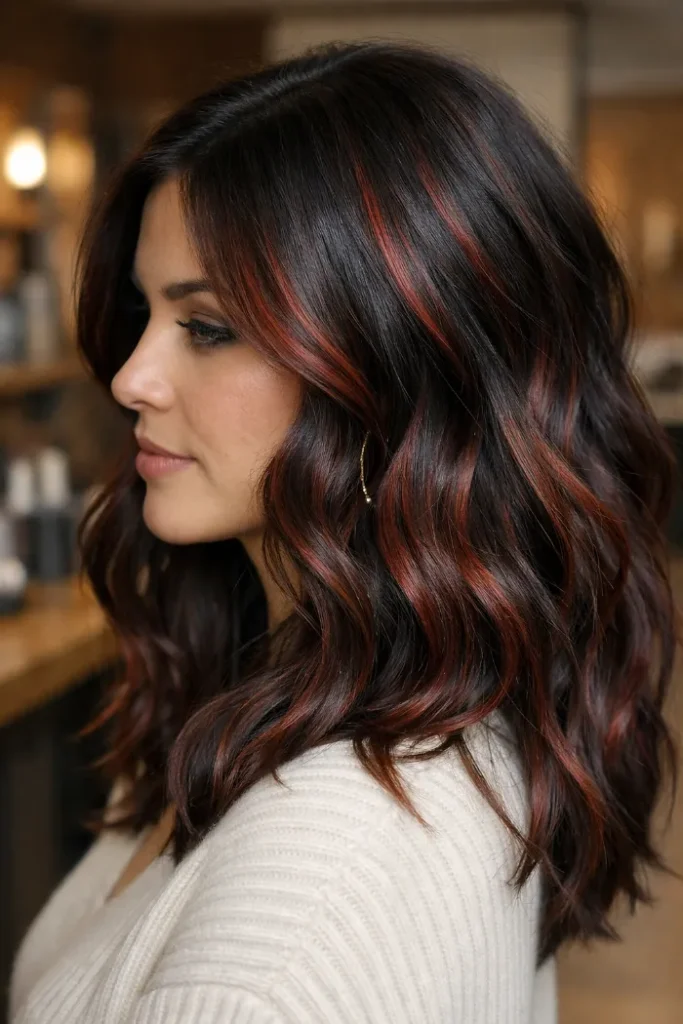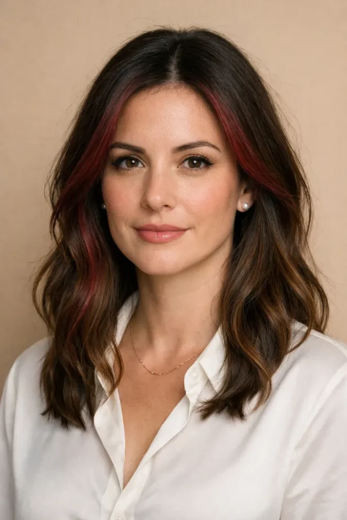 The red tones are painted in slim ribbons, so the brunette still does most of the talking. It gives dimension instead of a solid red block. Curling the ends helps the balayage pop. Use color safe shampoo to slow fading.