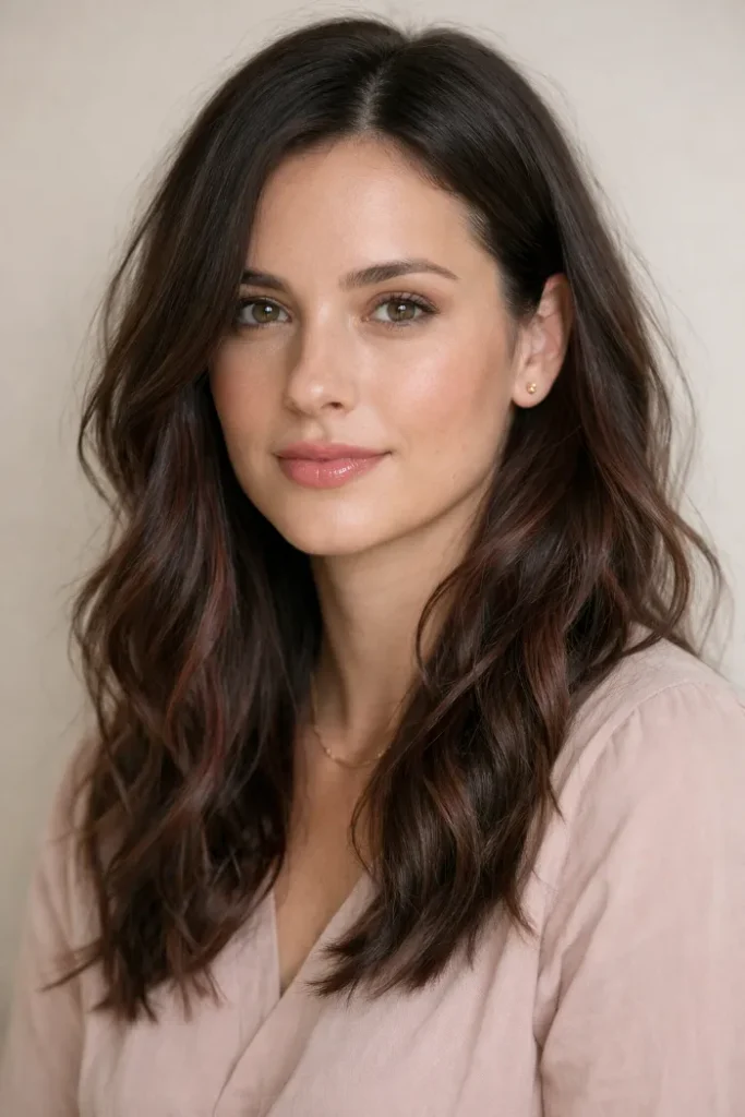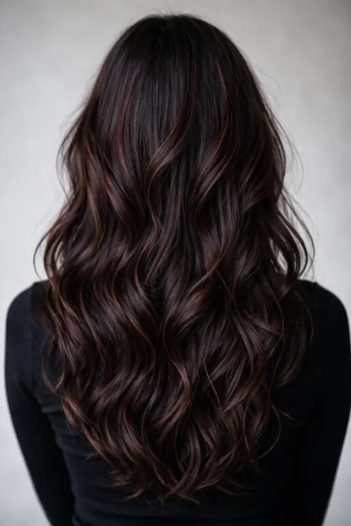 Dark hair looks amazing with cherry cola balayage because the contrast stays soft, not stripey. This version leans warm and glossy with subtle red streaks through the waves. It looks best with a smooth blowout or a quick curl wand.