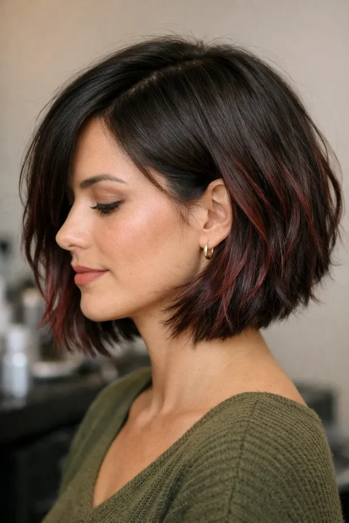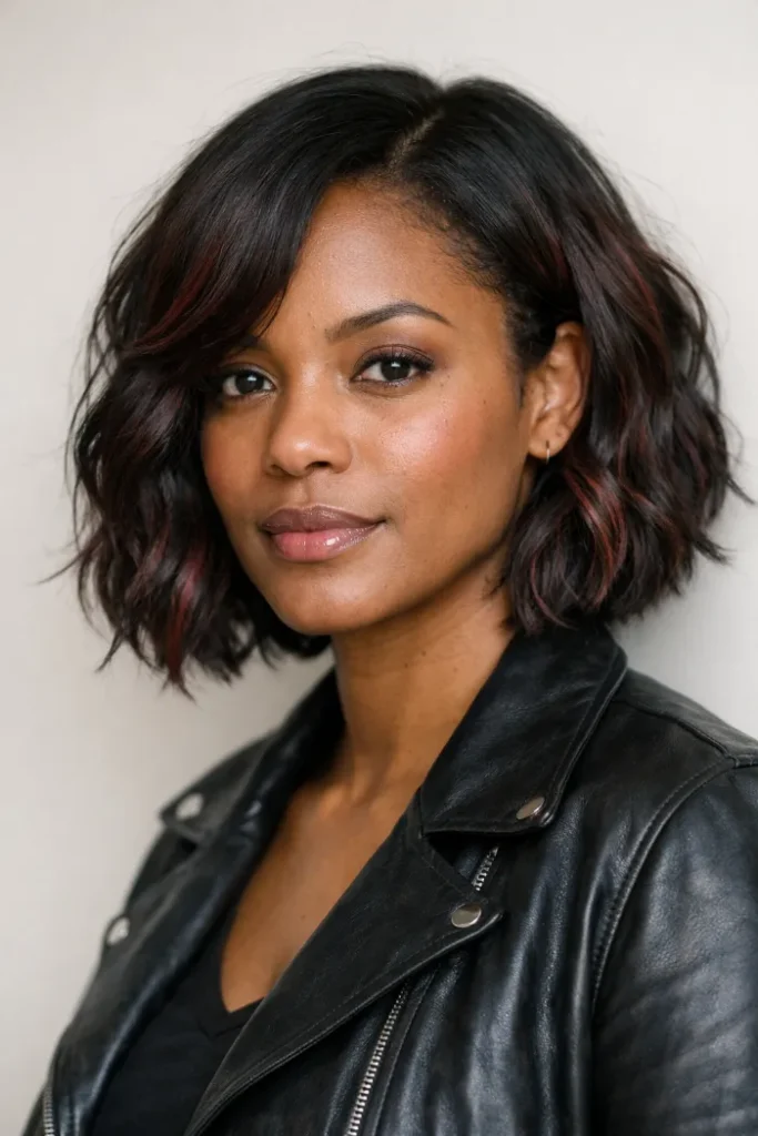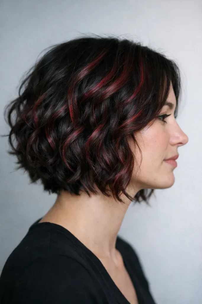 Soft ribbons of cherry cola peek through this wavy bob, especially around the ends and face area. It keeps the base dark, so the color feels wearable. Use a light mousse or curl cream to define texture and show the red.