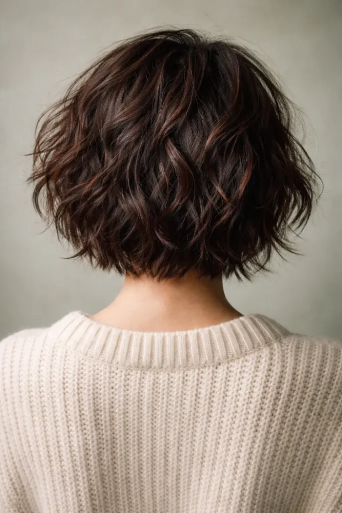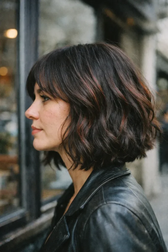 A short wavy bob looks even cuter with subtle cherry pieces woven through the ends. The color is placed where the waves bend, so it shows without taking over. Keep the root darker for easy grow-out. A quick curl wand brings it out.