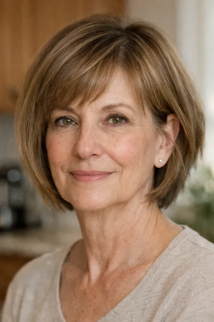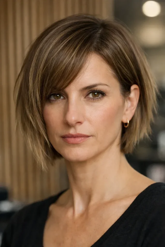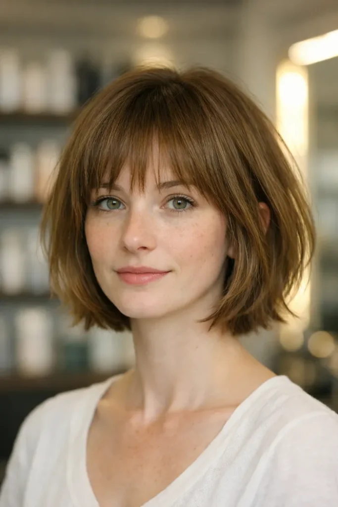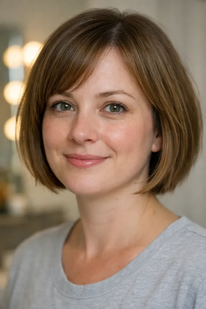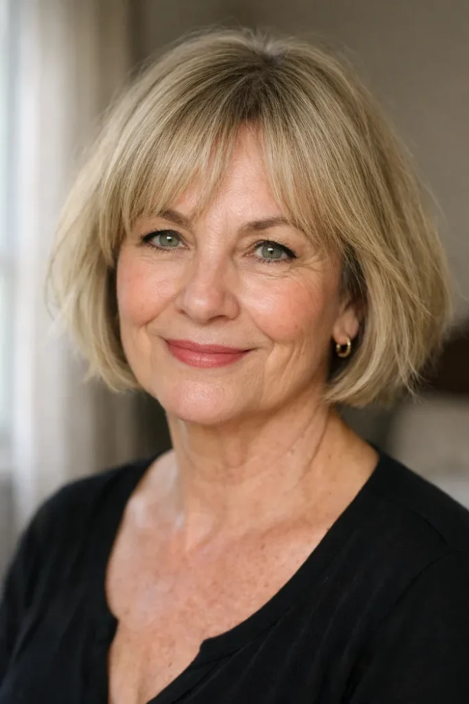 Ask for a chin-length bob with gentle layering and side-swept bangs. Blow dry with a round brush to lift the roots and keep the front light.