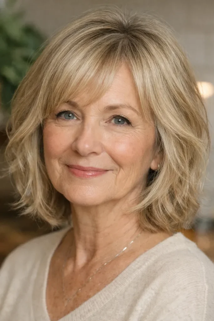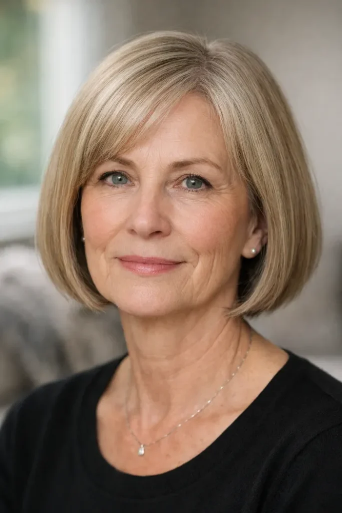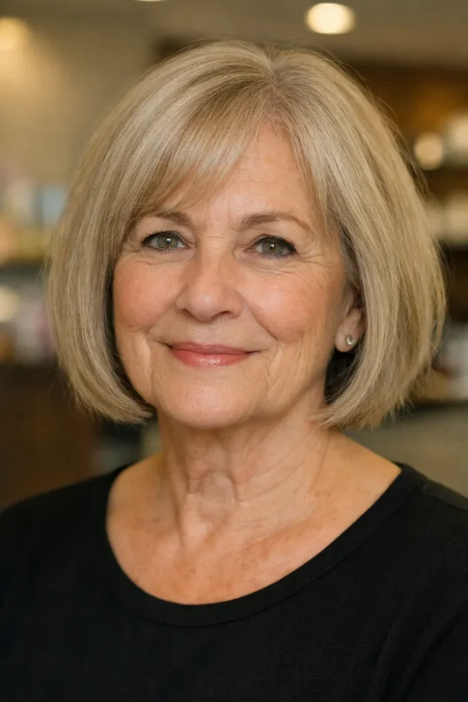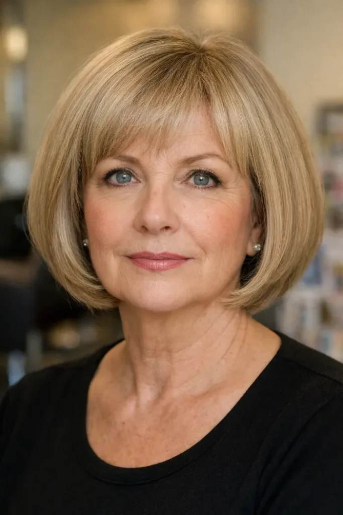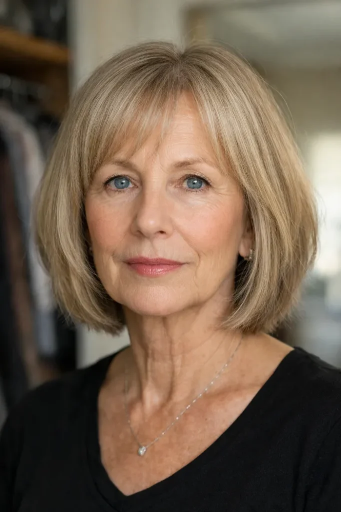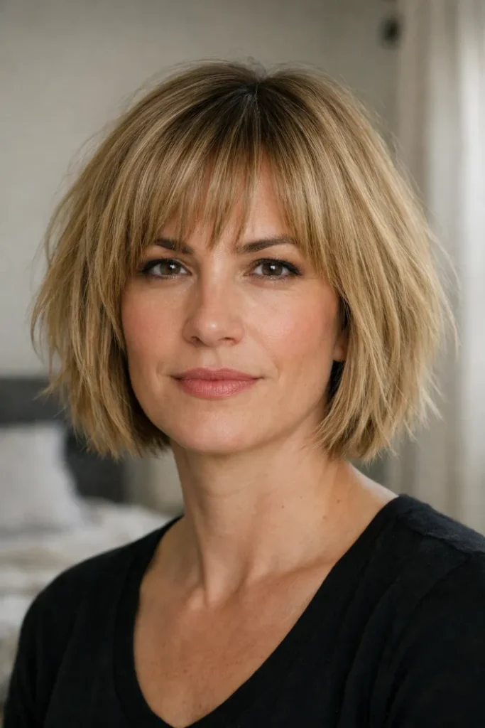 Ask for a chin-length bob with gentle layering and side-swept bangs. Blow dry with a round brush to lift the roots and keep the front light.