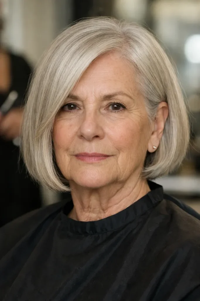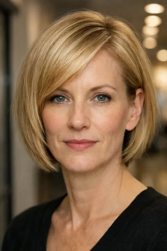 This deep side-part bob creates instant lift at the front and gives fine hair a fuller look without needing a lot of layers. The sweep across the top helps the style look thicker right away.