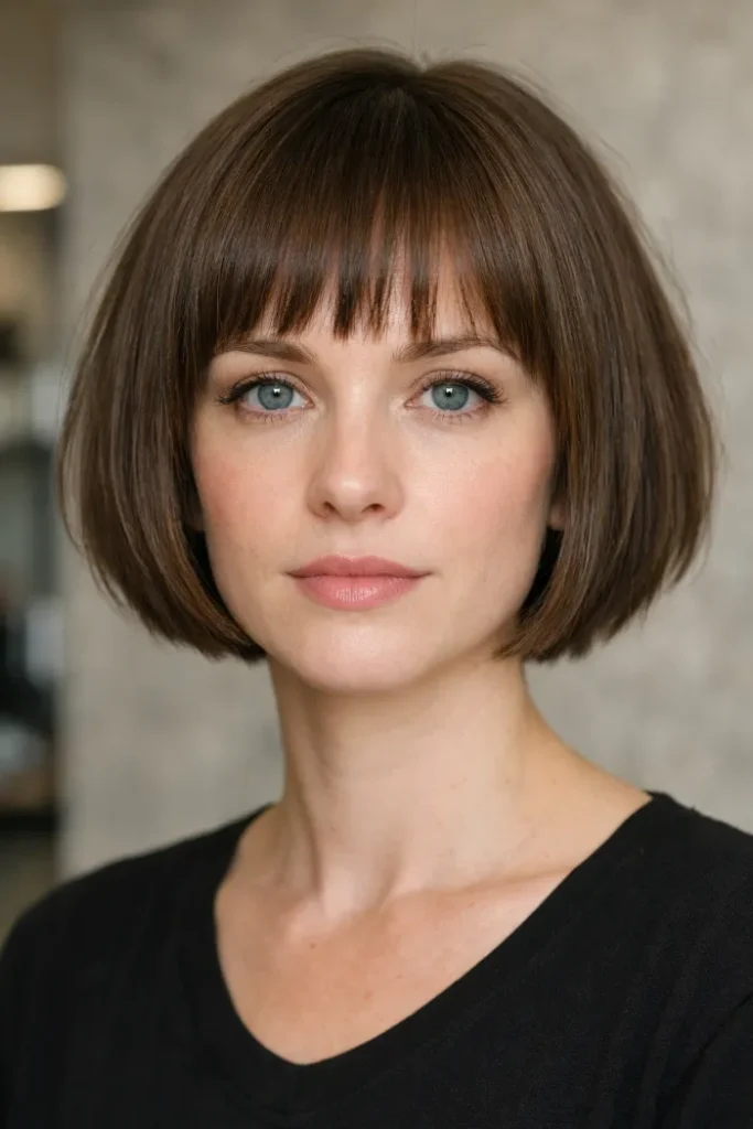 This French bob has a neat shape with soft blunt bangs that frame the eyes while keeping the cut compact and full. It is a good choice when you want structure without a heavy finish.