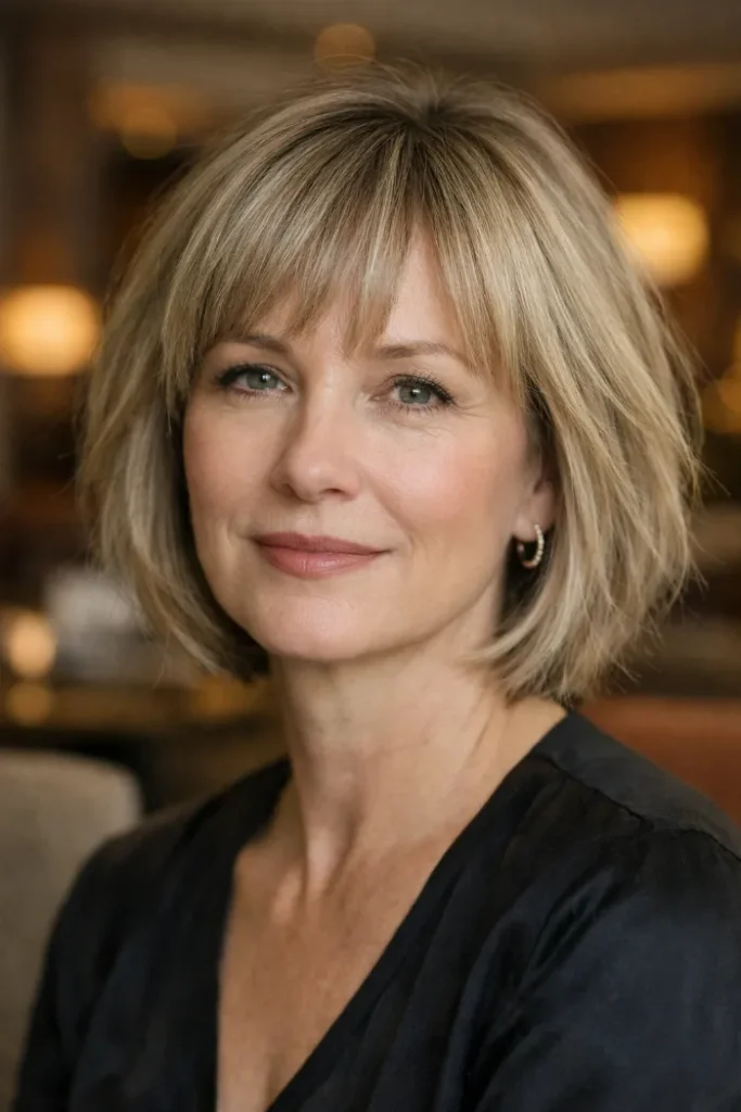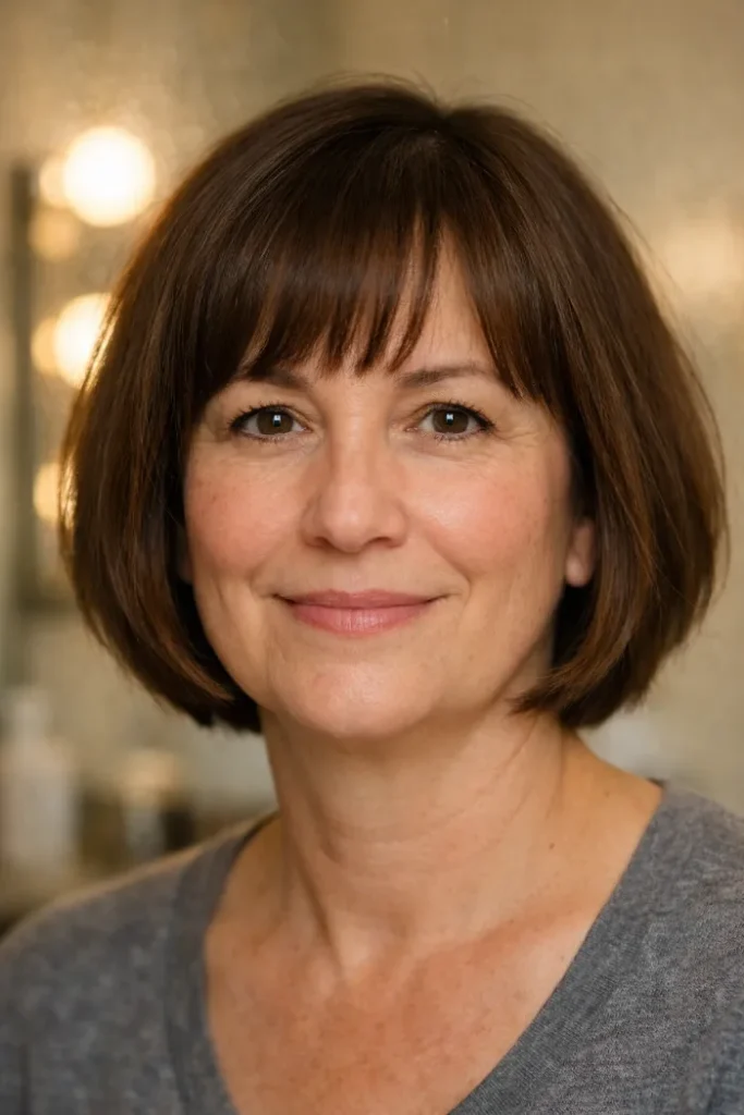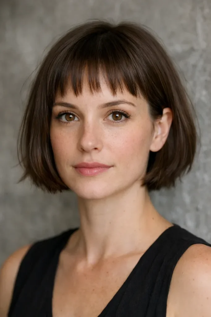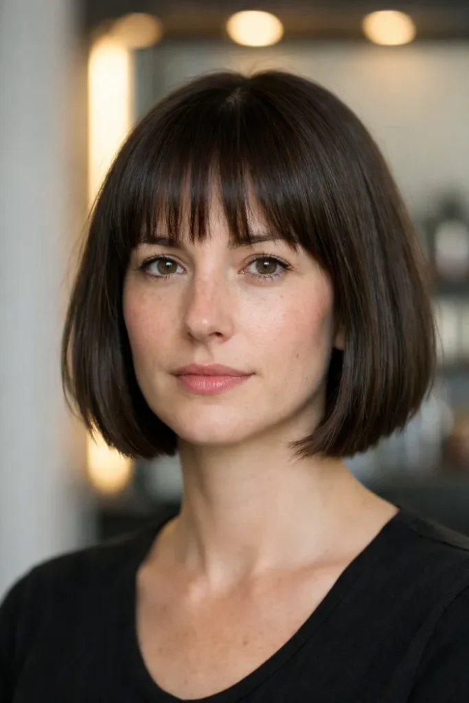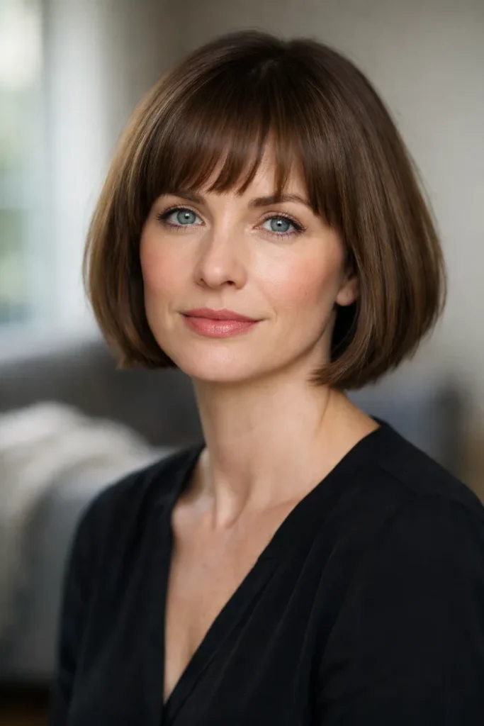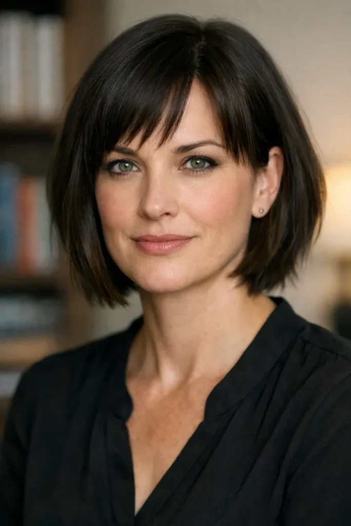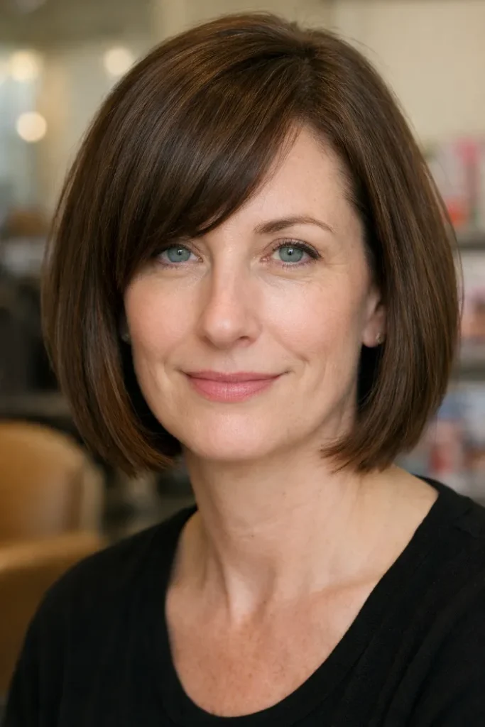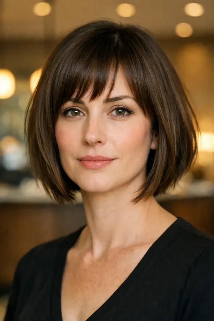 This chin-length bob feels smooth and face-framing, with the deep side fringe doing most of the softening around the eyes and cheekbones.