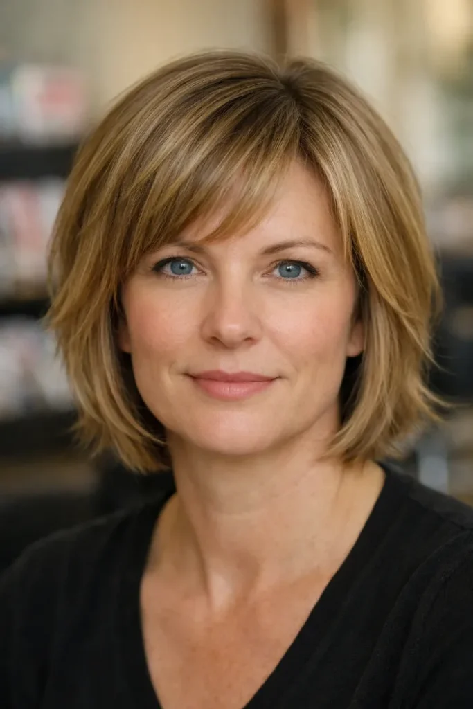This layered chin bob has soft lift and movement, and the side-swept bangs break up the shape in a way that feels easy and flattering.