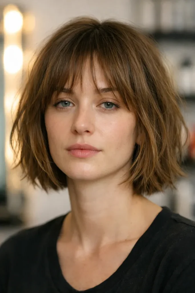 This French-inspired bob sits right at the chin and feels effortless, with light bangs and a slightly undone finish that looks chic without trying hard.
