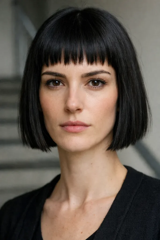 This sharp chin bob feels bold and graphic, but the micro-texture in the bangs keeps it from looking too severe or flat.