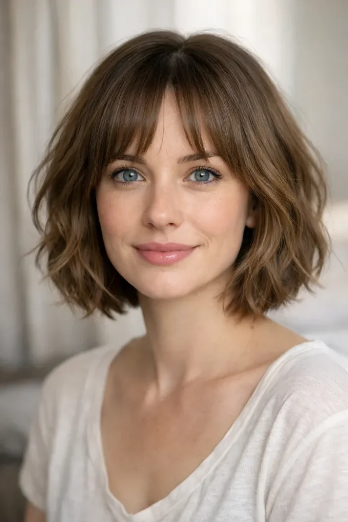 This chin-length bob has loose texture that makes it feel fuller, and the wispy fringe keeps the waves from looking too bulky at the top.