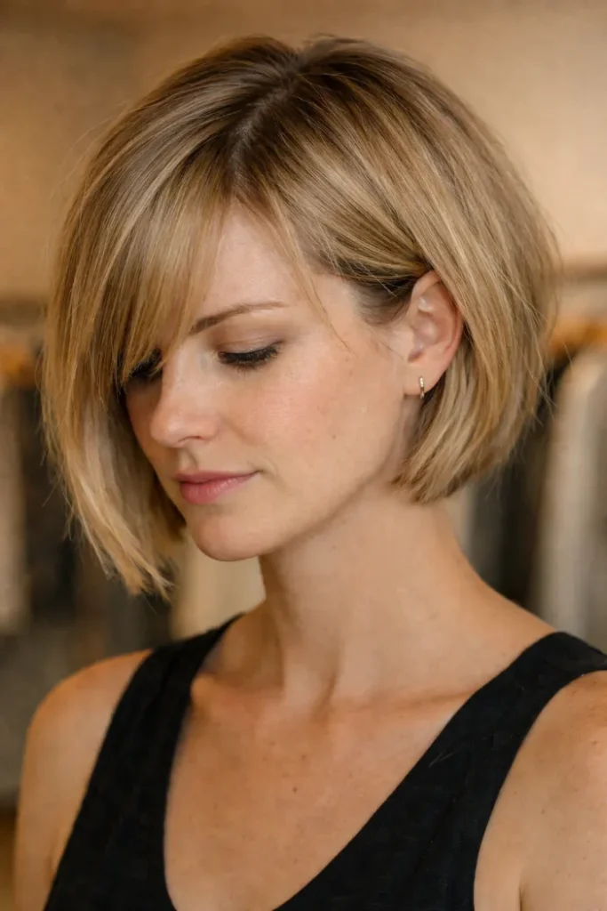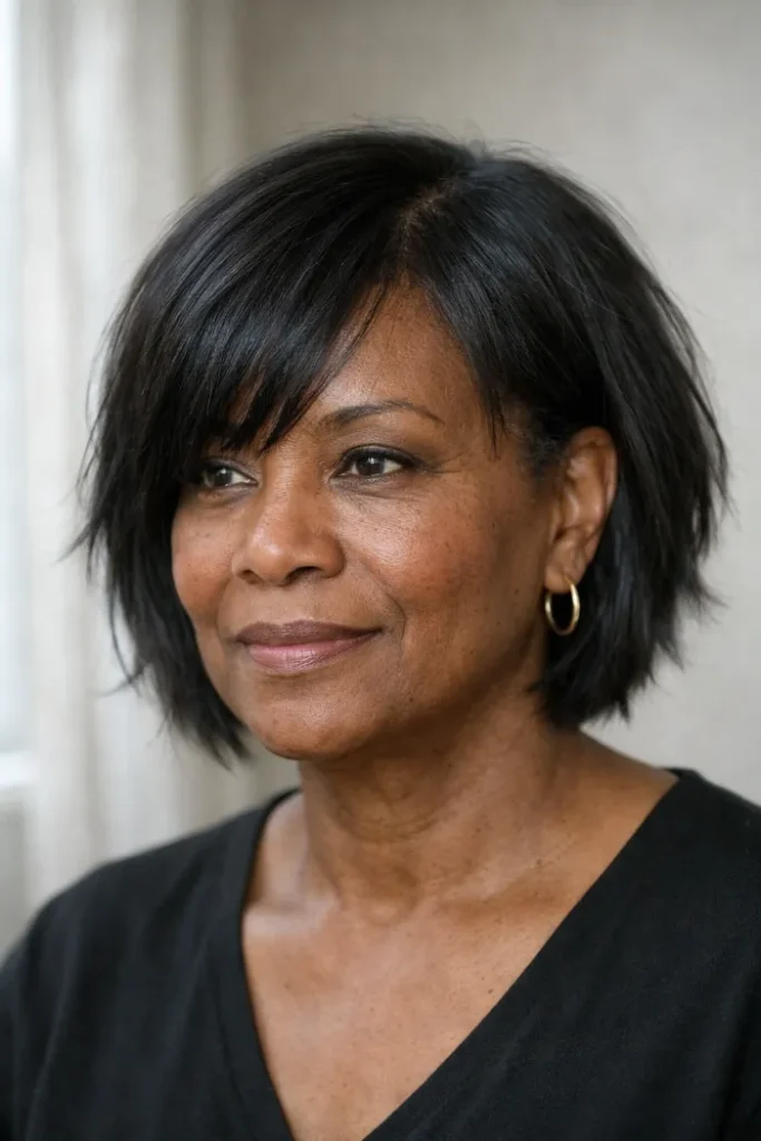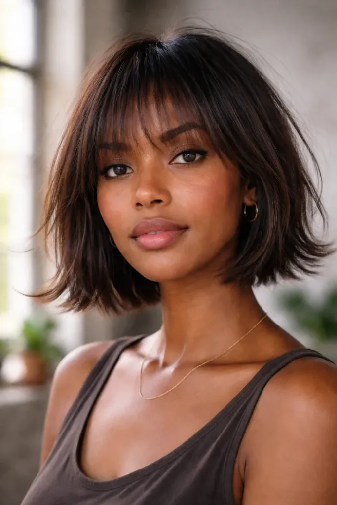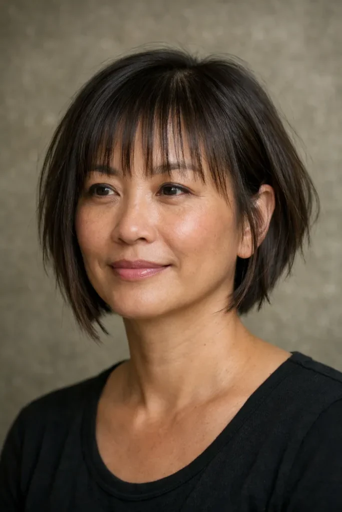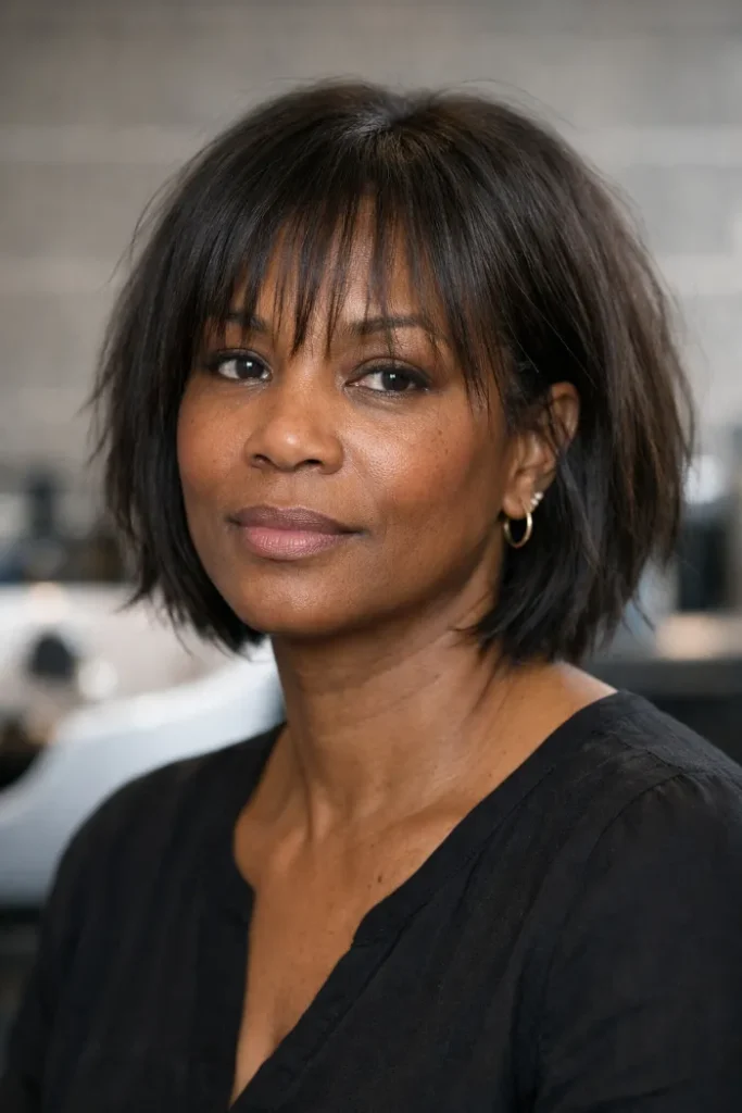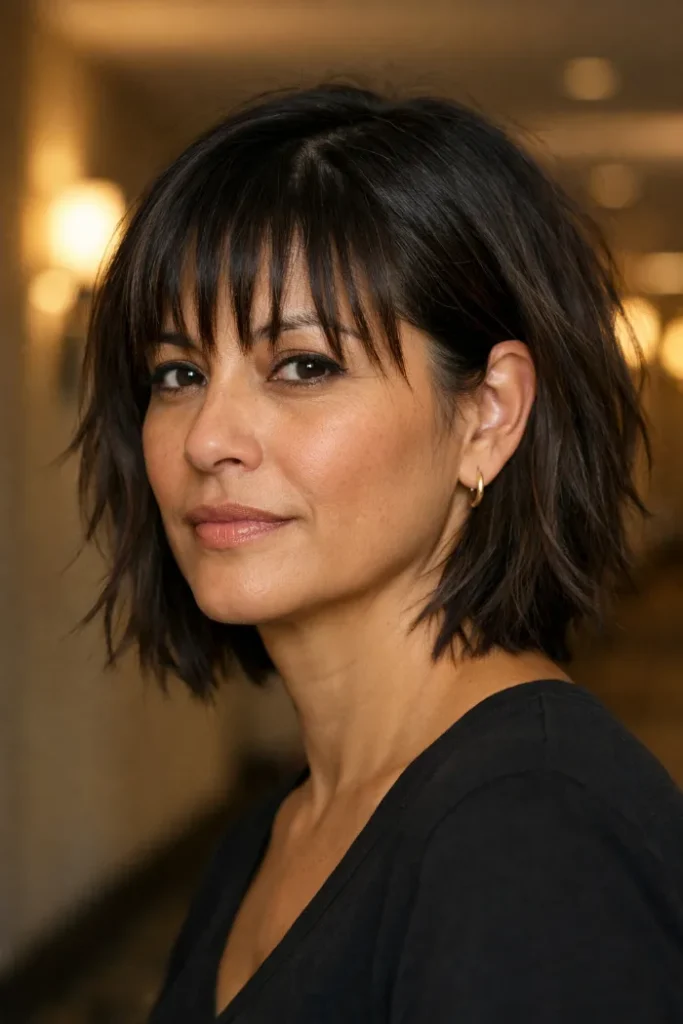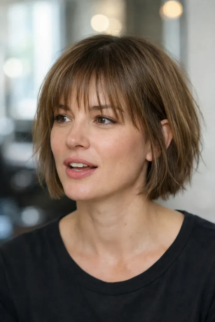 This classic choppy bob with soft bangs sits just below the chin and feels clean but not stiff. The ends are lightly textured for movement. If your hair falls flat, ask for a tiny bit of internal layering for lift.