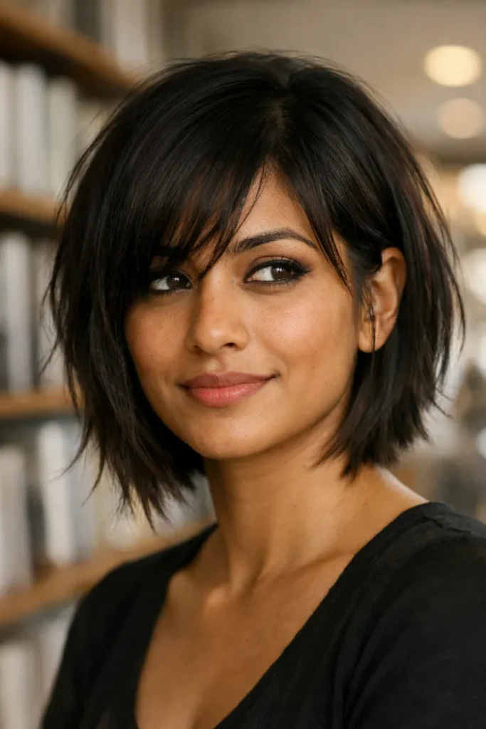 An inverted choppy bob gives you lift at the back and a longer front that skims the jaw. The light fringe keeps the look balanced and draws attention to the eyes. Ask for a soft stack and keep the ends textured, not blunt.