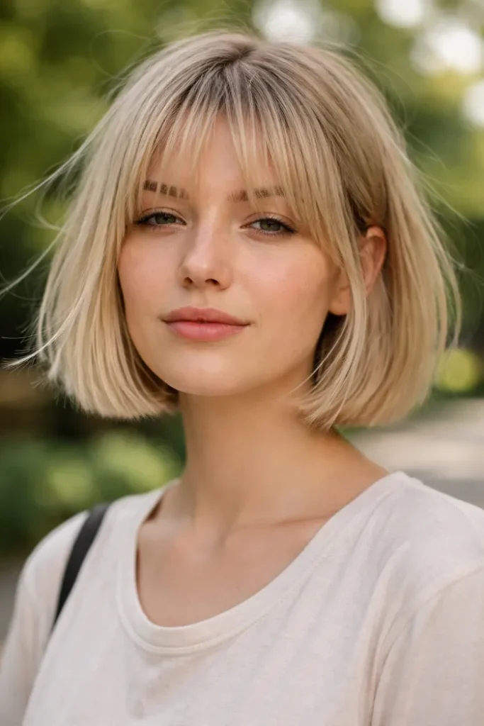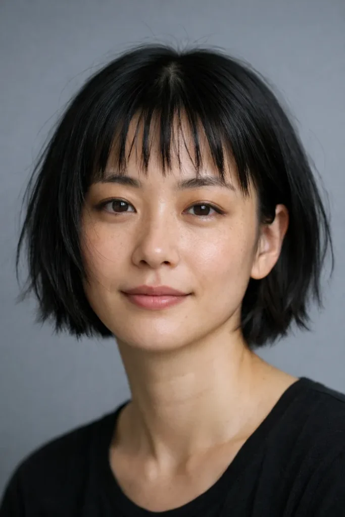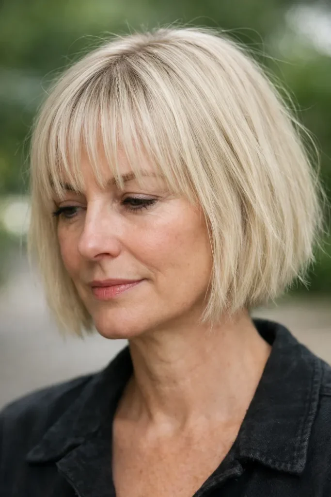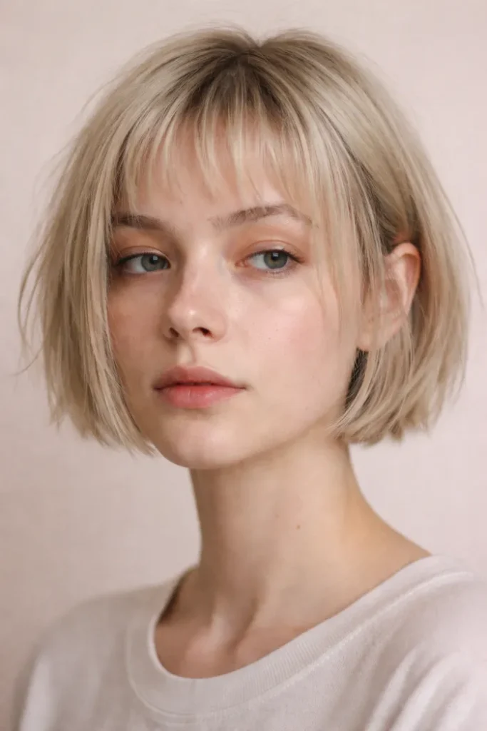 This blunt bob is cut compact and slightly choppy through the ends, so fine hair looks thicker. The straight fringe is full but not heavy. Ask for point cutting at the tips to keep it from looking boxy.