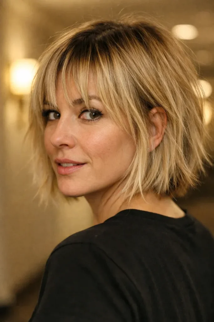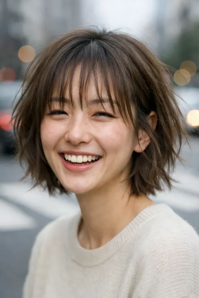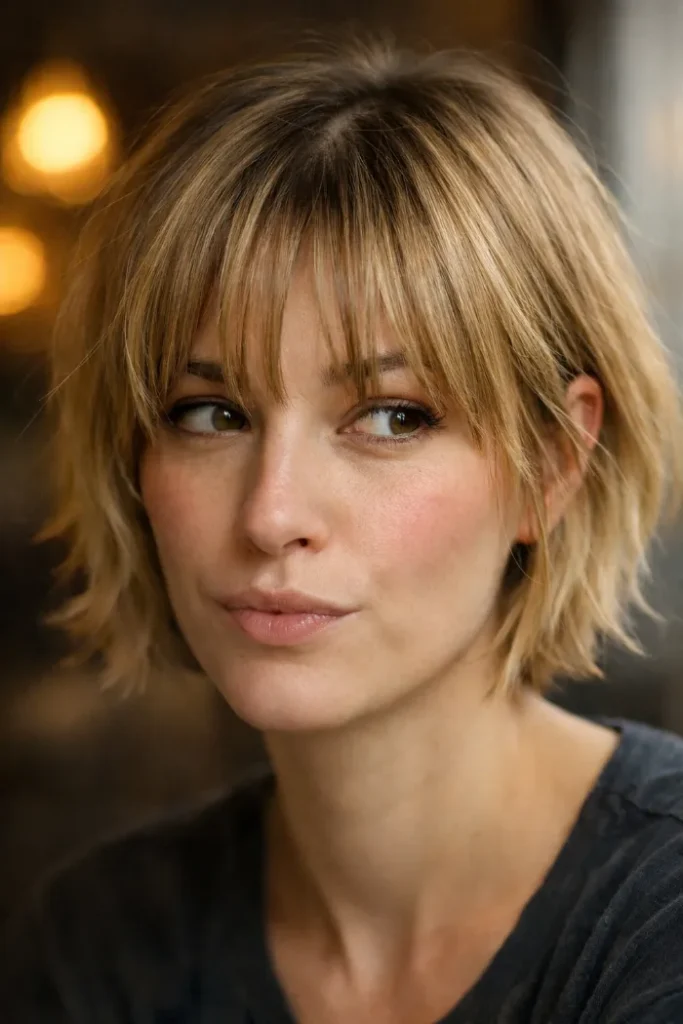 This shaggy choppy bob is full of airy texture, with wispy bangs that break up the forehead without feeling heavy. The ends are intentionally messy and easy to revive with dry shampoo. Ask for a razor finish so it stays light.