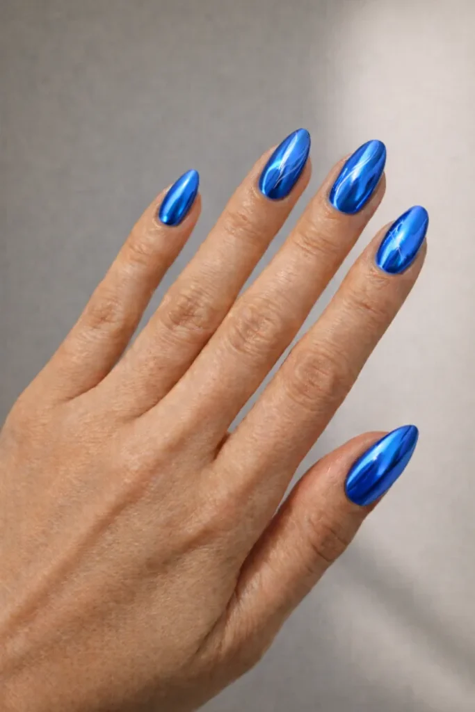 This electric blue chrome brings a bold pop of color to fall nails. The high-shine finish reflects beautifully, while the almond shape keeps it sleek rather than overpowering. It’s a confident choice if you like your manicure to stand out.