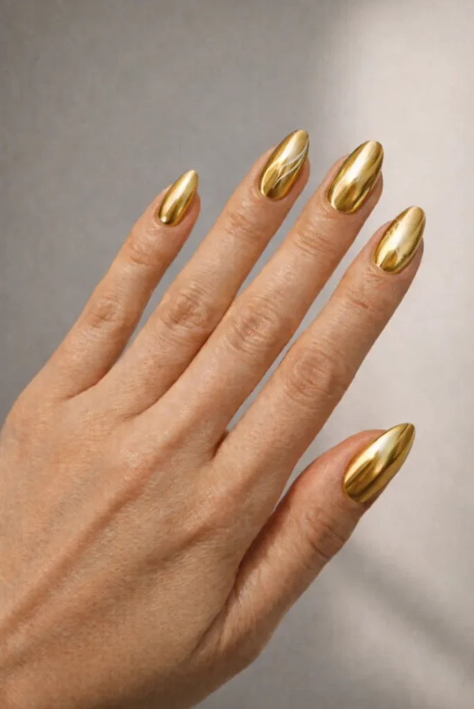 Gold chrome always feels right when fall arrives. This warm metallic shade brings instant luxury, while the almond shape keeps it balanced and wearable. It’s eye-catching without feeling too much, making it perfect for both casual days and dressier moments.