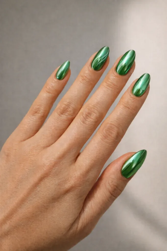 19. Emerald Chrome Almond Nails