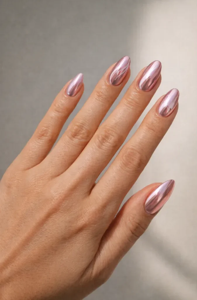 These pearlescent pink chrome nails have a luminous, light-catching glow that’s both romantic and modern.