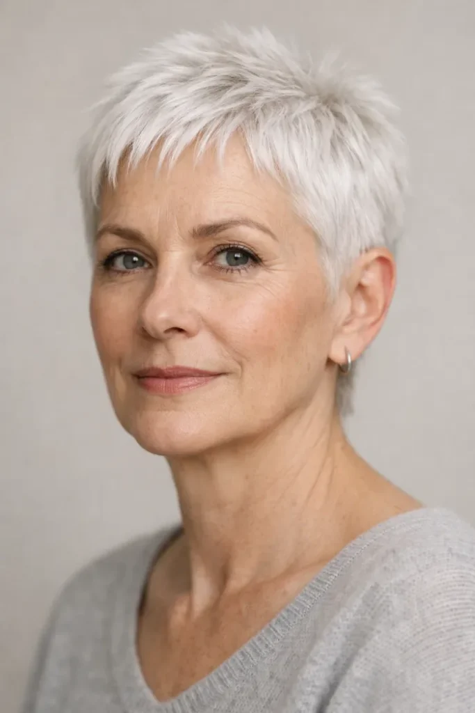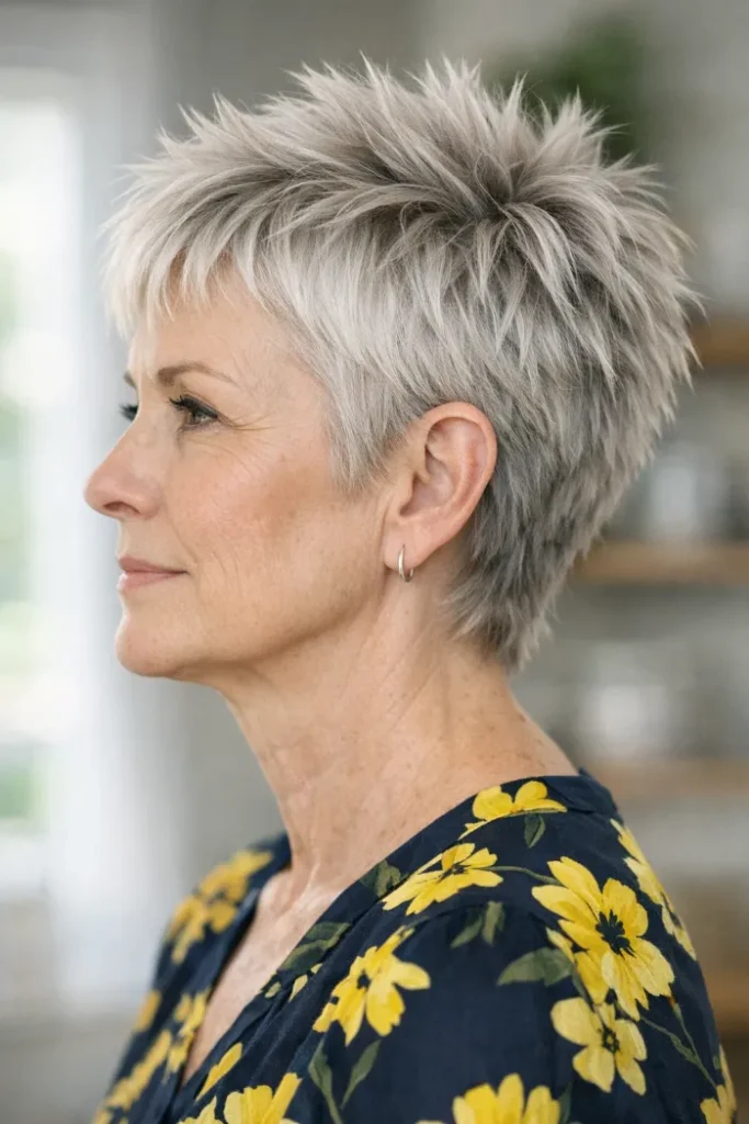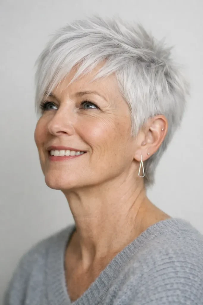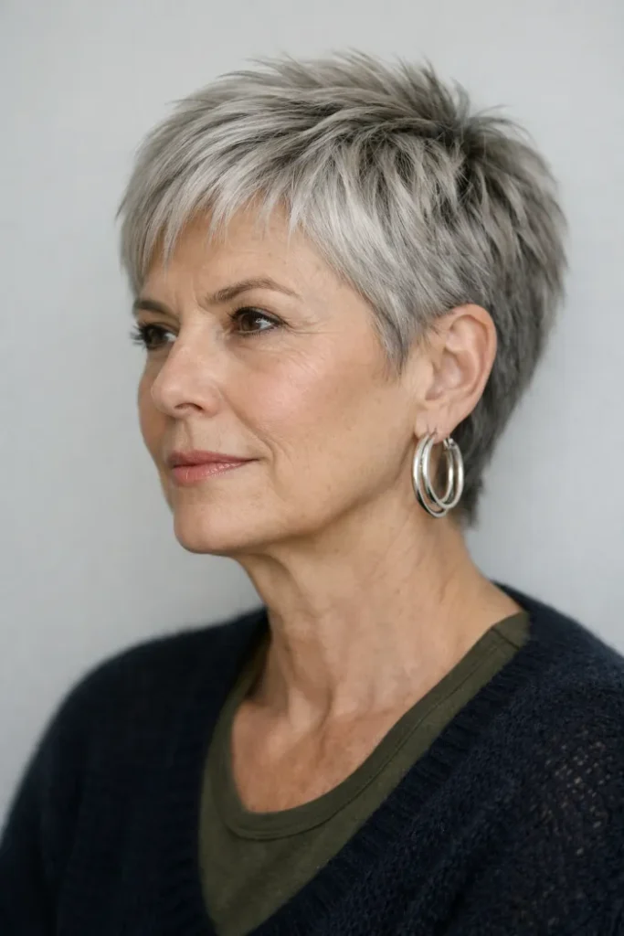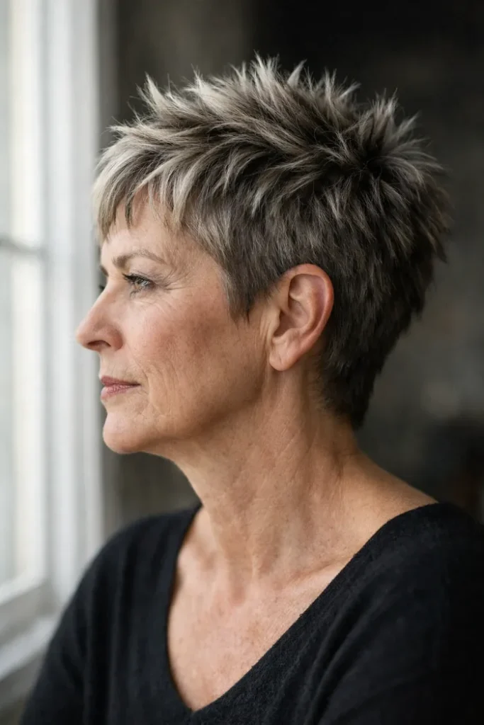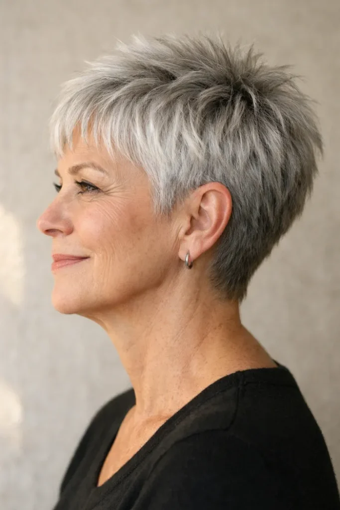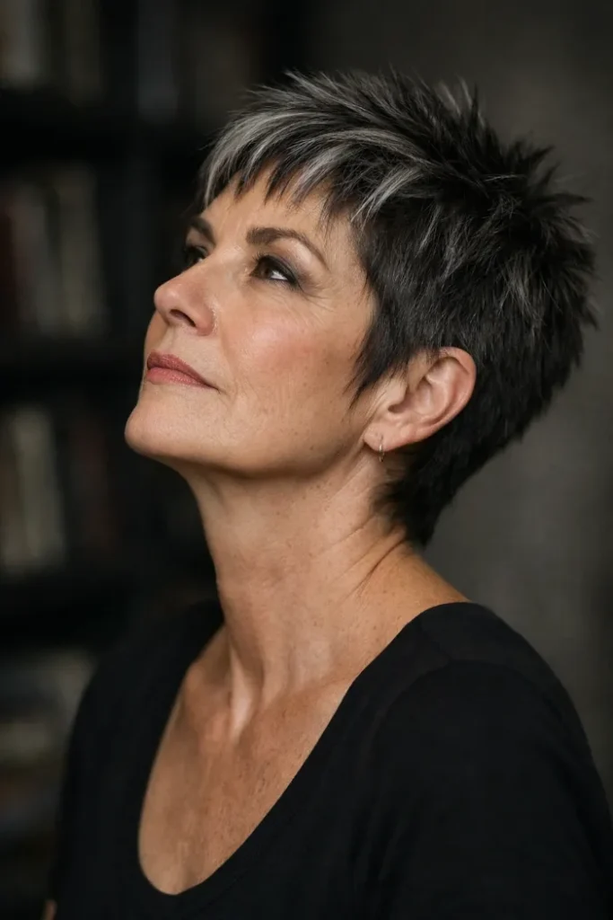This edgy pixie builds height through the crown with short, spiky layers and brighter silver tips that make the texture stand out even more. The close sides keep it neat, while the longer top gives the shape a sharper, more playful finish.