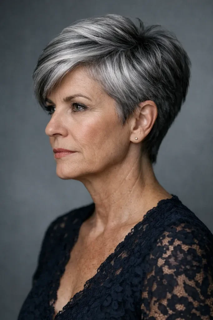 Ask for a pixie with structured sweep through the top, tapered sides, and blended silver dimension for a sculpted finish.