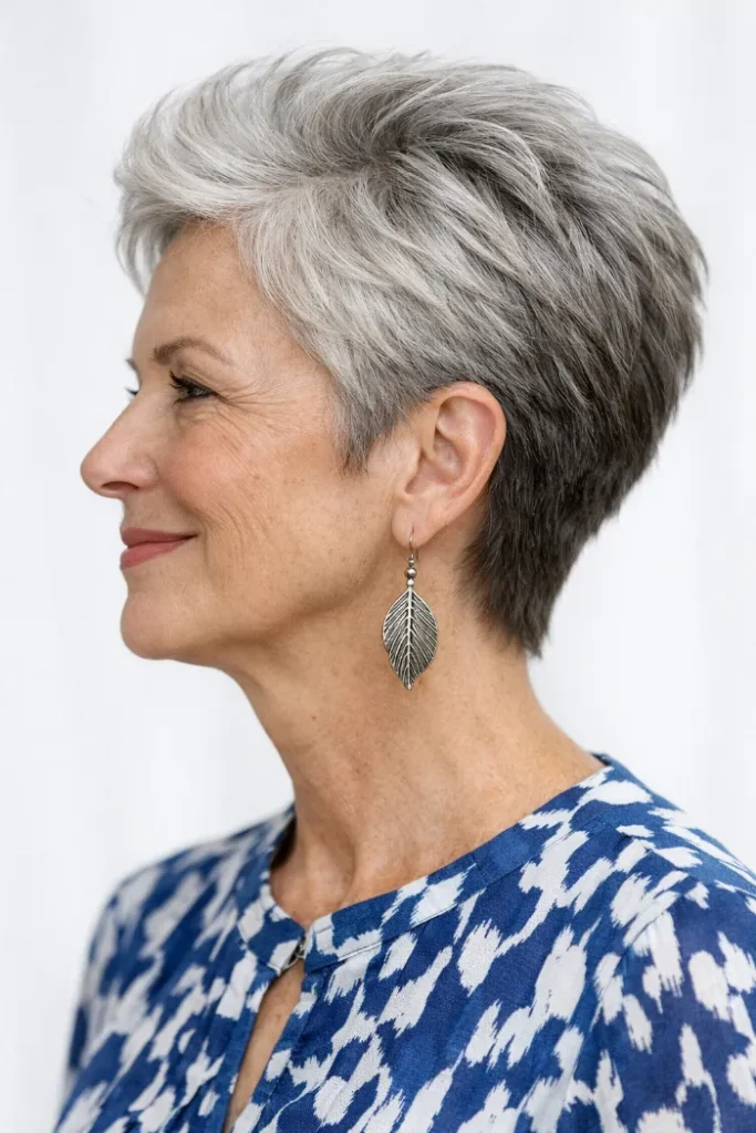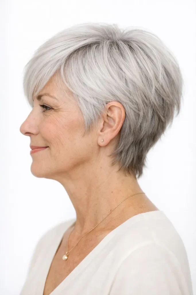 Ask for a layered silver pixie with a soft top and a close, tapered nape that keeps the back looking tidy.