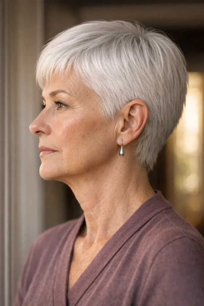 This lifted silver pixie pushes the hair back and up, giving the whole profile a fuller, more open shape. It feels elegant, but the shorter sides keep it crisp. It is edgy in a quieter way, with height and direction doing most of the work.
