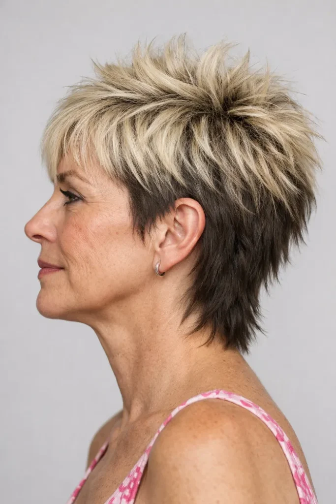 This two-tone pixie mullet is the boldest look in the group, with spiky blonde layers on top and darker length through the back. The contrast makes the texture stand out fast. It feels edgy, playful, and a little rebellious without losing shape.