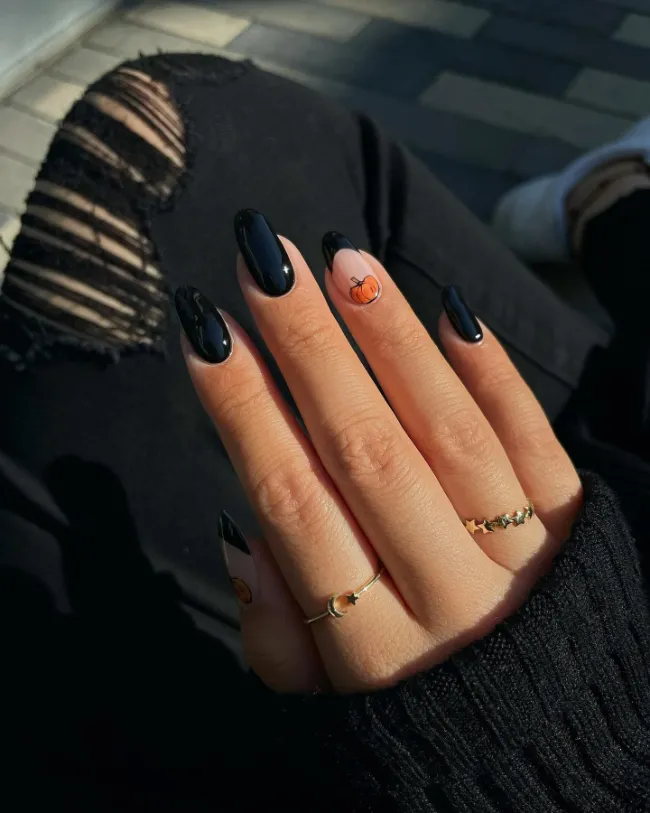 Black nails are timelessly edgy, but adding a tiny pumpkin accent makes them fall-ready in the most playful way. The glossy finish keeps the look sleek, while the seasonal motif adds a festive twist. Perfect for autumn outings, Halloween parties, or just showing off fall spirit.