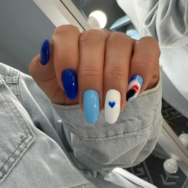 This bold manicure combines multiple shades of blue with crisp white accents for a fun yet refined look. The tiny blue heart detail and abstract swirls make it stand out while still being wearable. A great choice if you love vibrant colors but want to stay classy.