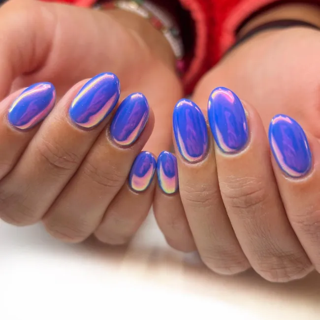 Shimmery, iridescent blue nails are perfect for adding glamour to your fall looks. The color shifts beautifully under different lighting, making your nails sparkle with every movement. It’s a trendy, bold option for anyone who wants their nails to pop without being too overwhelming.