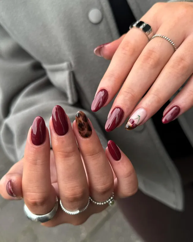 Burgundy is already a fall favorite, but adding an accent nail with tortoiseshell or delicate floral art elevates the look. This combination is stylish, classy, and unique without being too busy. It’s perfect for nail lovers who want their fall manicure to feel custom and creative.