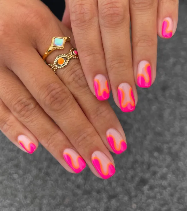 Who says fall nails have to be muted? Neon pink and orange waves bring a vibrant, playful edge to the season. This bold design balances fun and class, making it a standout choice. It’s perfect for adding personality to your manicure while still looking polished and stylish.