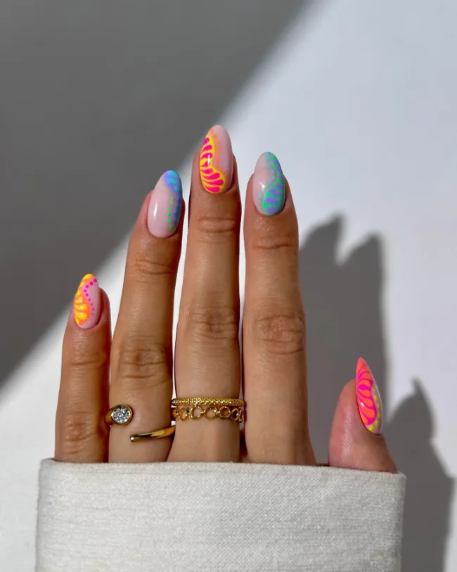 Multicolor neon accents on a nude base bring an artsy, modern twist to fall nails. The nude background keeps the manicure classy, while the vibrant swirls add a playful pop. This look is ideal for anyone who loves to experiment with color while still keeping things stylish and elegant.