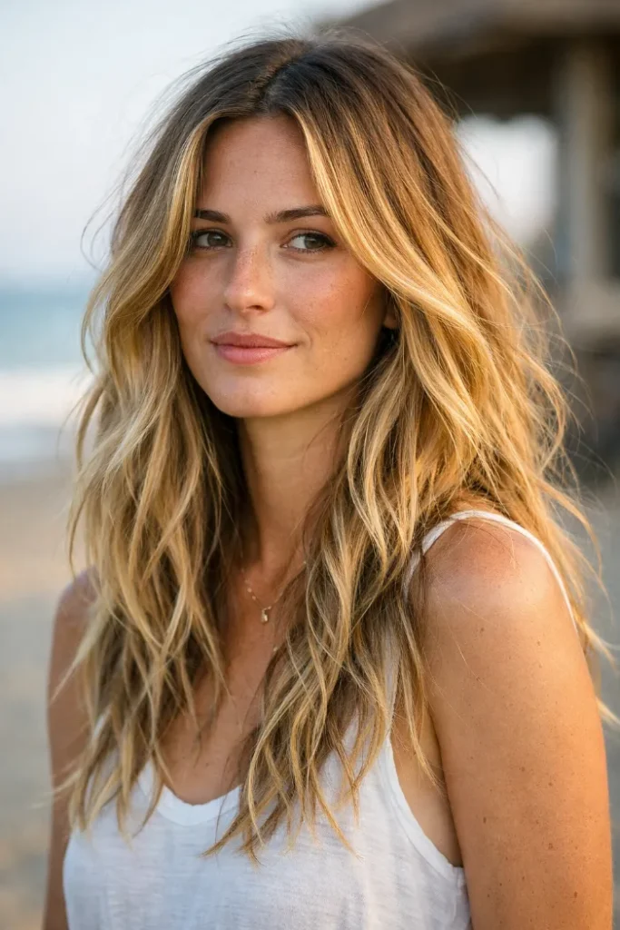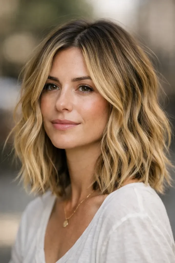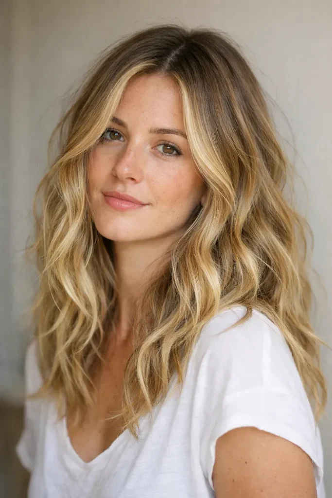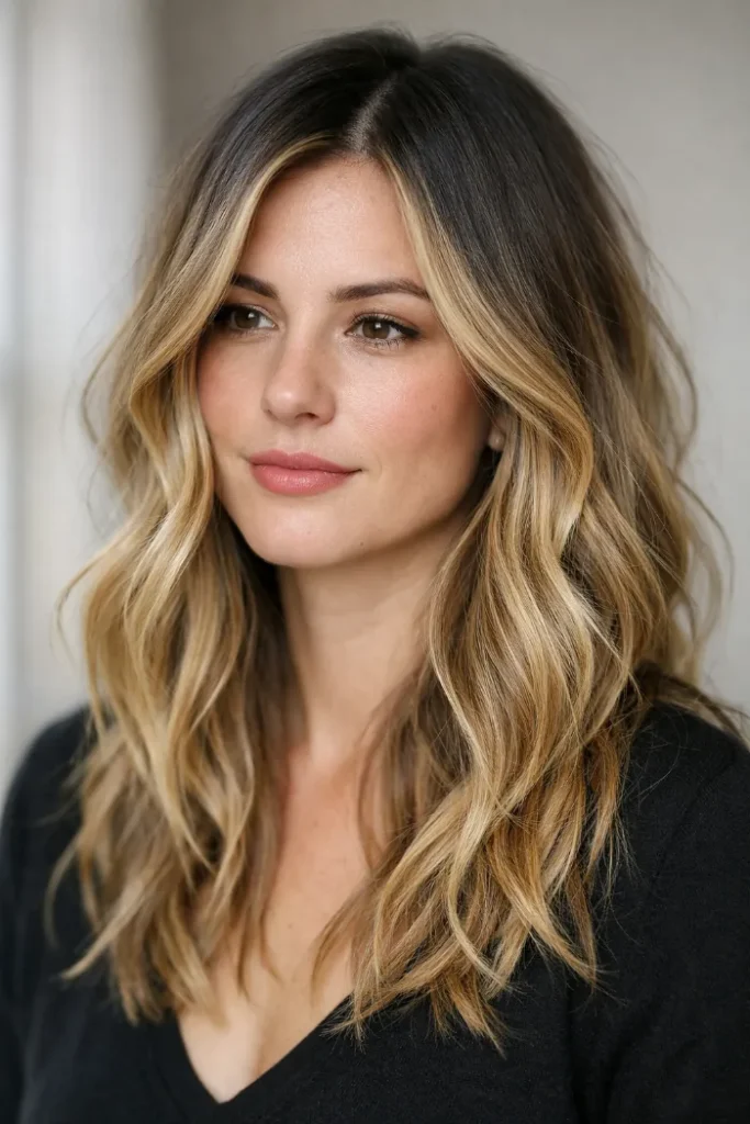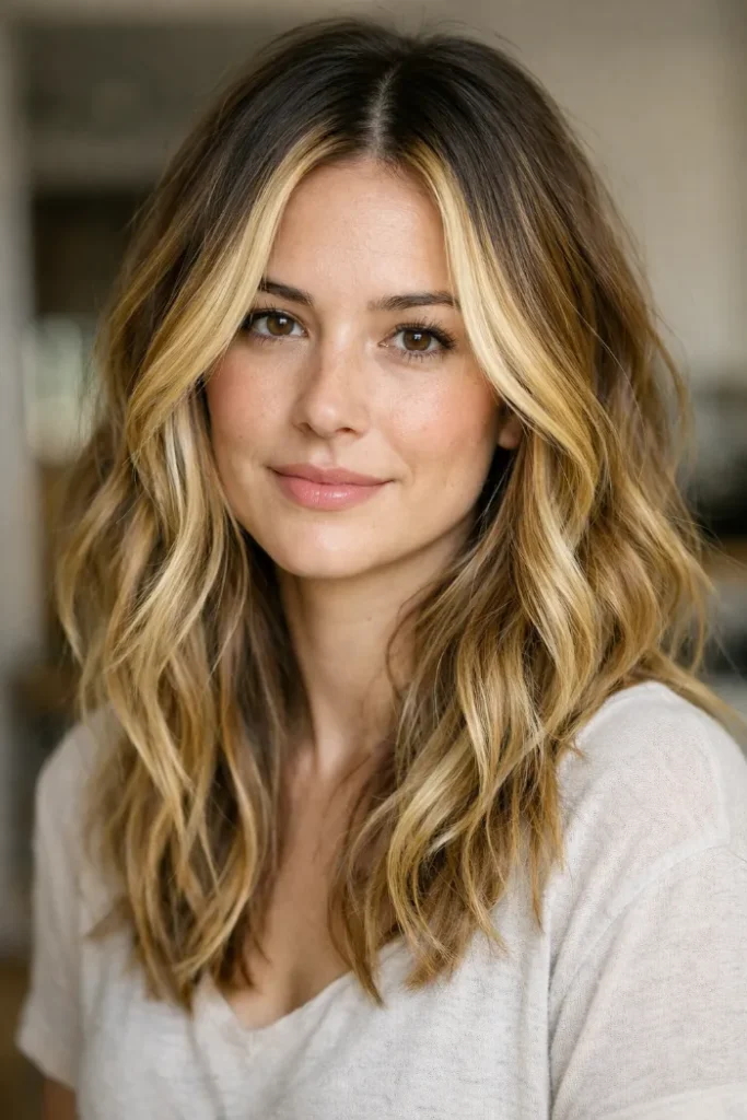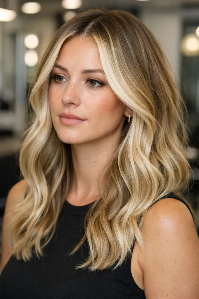 Darker roots add depth, while the blonde through the ends keeps everything light. It’s a low-fuss look that still feels styled, especially if you like air-dried texture.