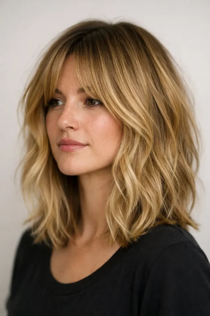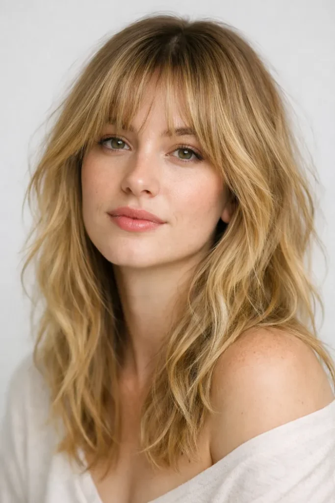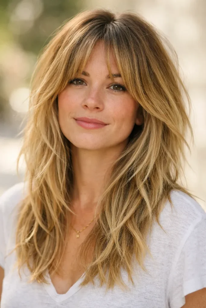 Feathered bangs add movement around the face, while golden blonde balayage keeps the style light and fresh.