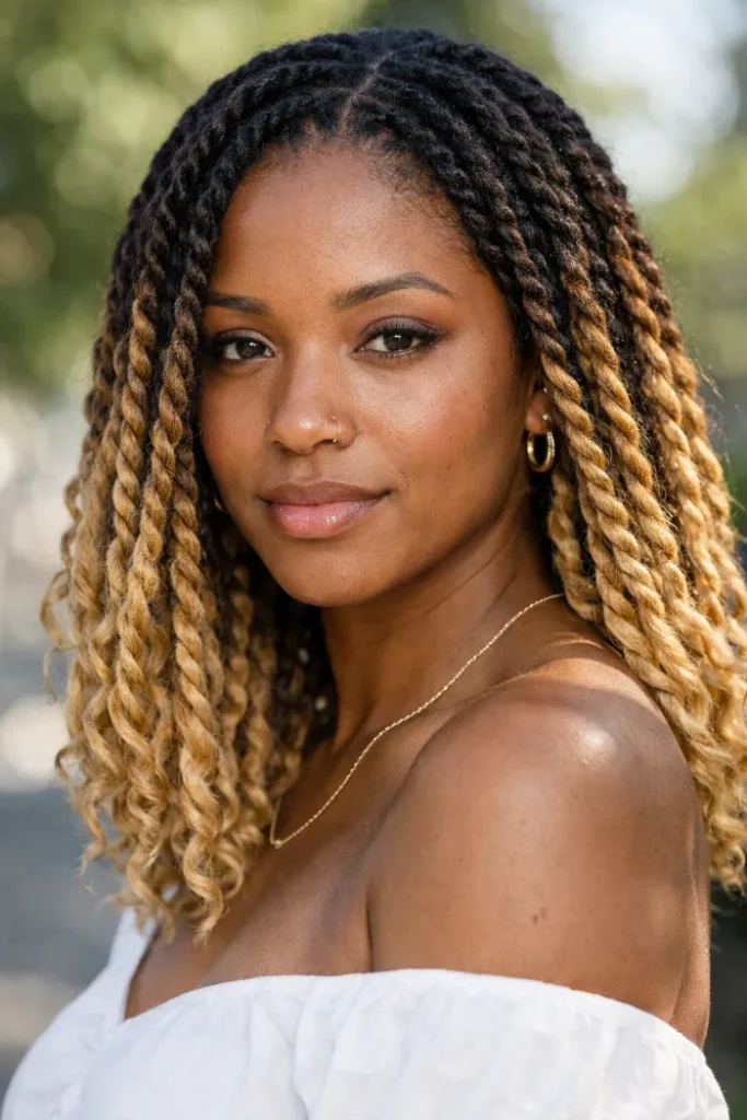 Golden blonde highlights woven through twists add warmth and depth without overpowering the style.