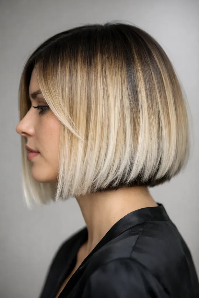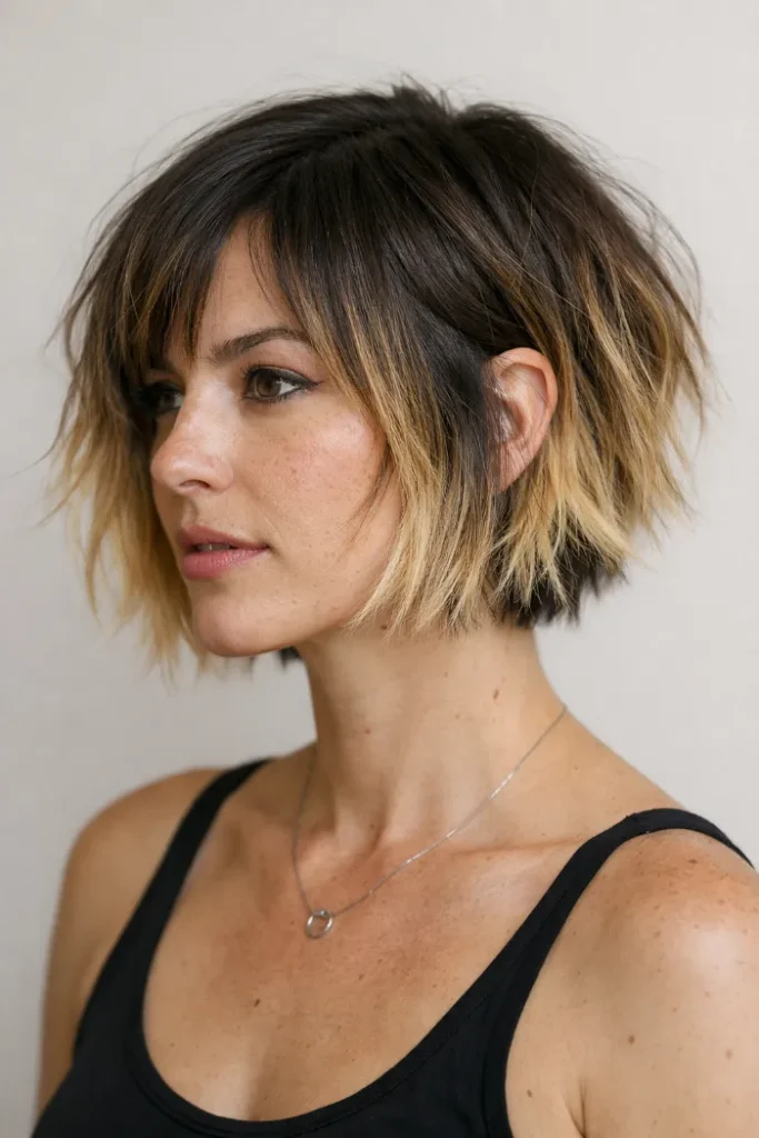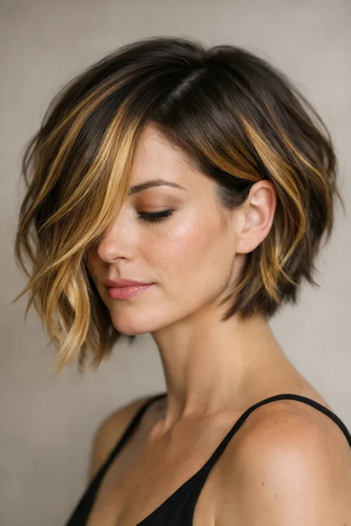 Golden balayage lightens the front sections and mid-lengths, adding dimension without overwhelming the cut. It’s a great balance of structure and softness for everyday wear.