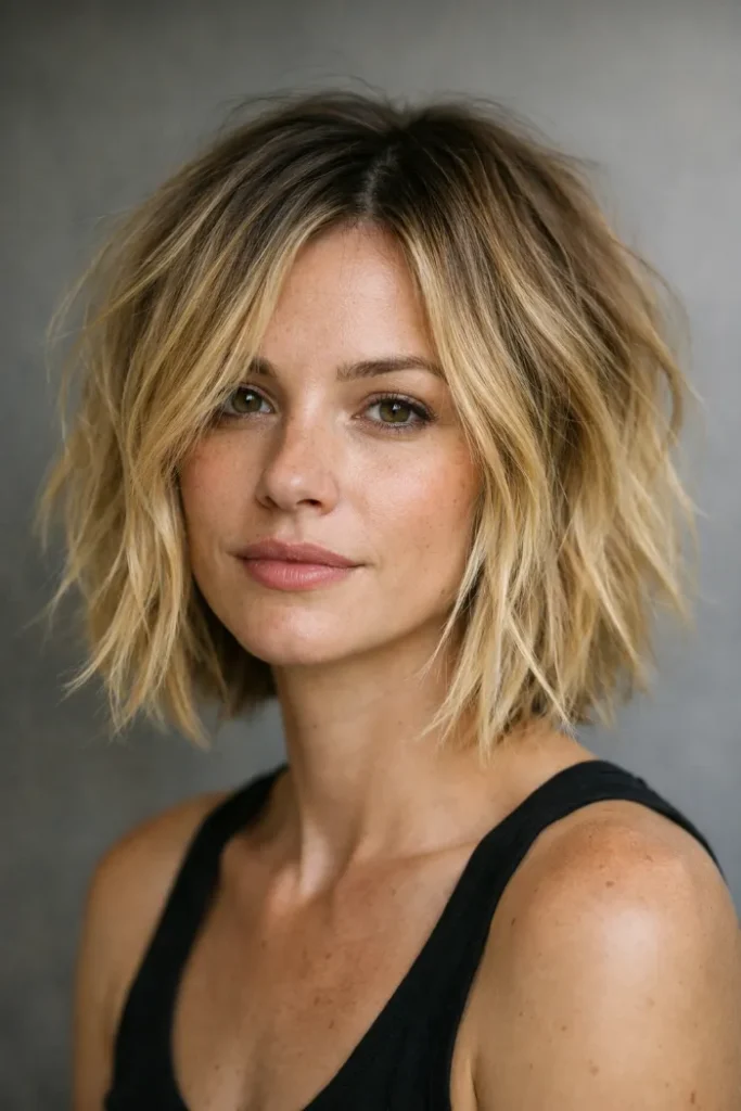 26. Tousled Blonde Bob with Darker Roots