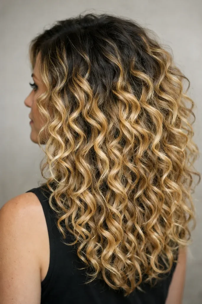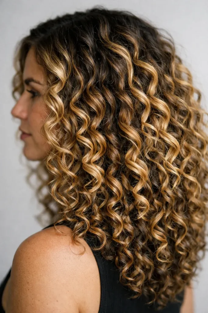Big, bouncy curls like these love balayage because the color shows up in the best way—piece by piece.