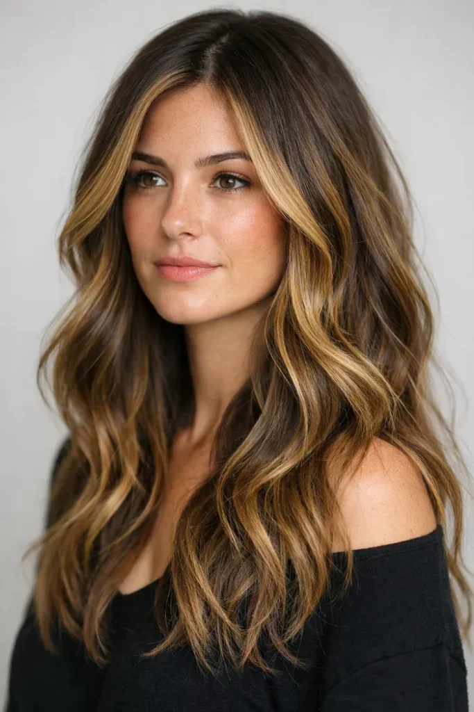 A rich brunette base keeps this look grounded, while golden blonde balayage adds warmth through the lengths.