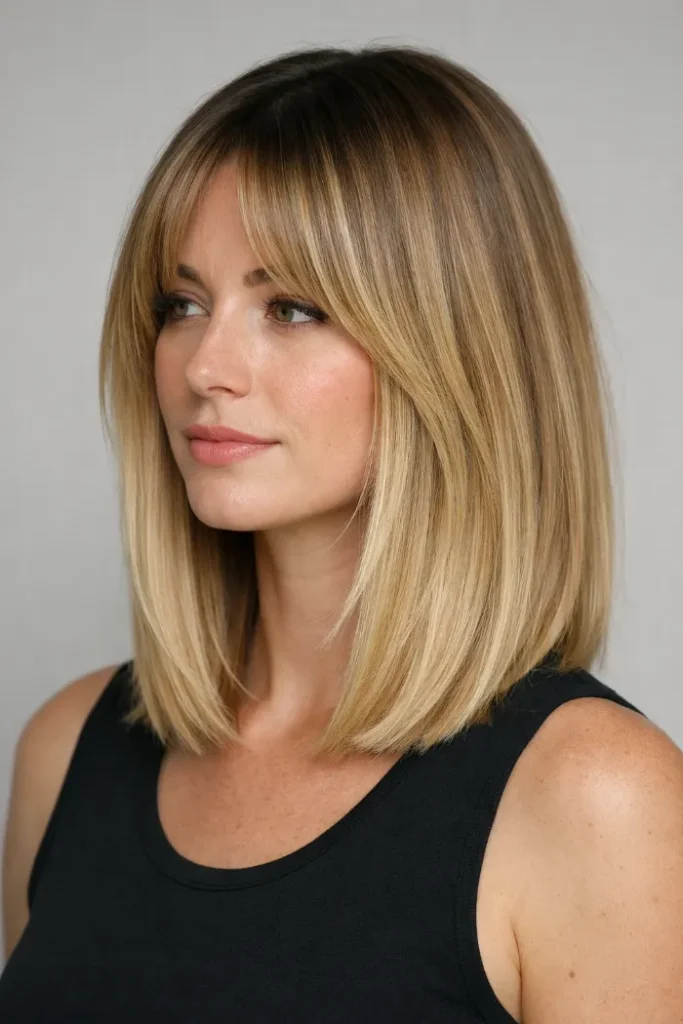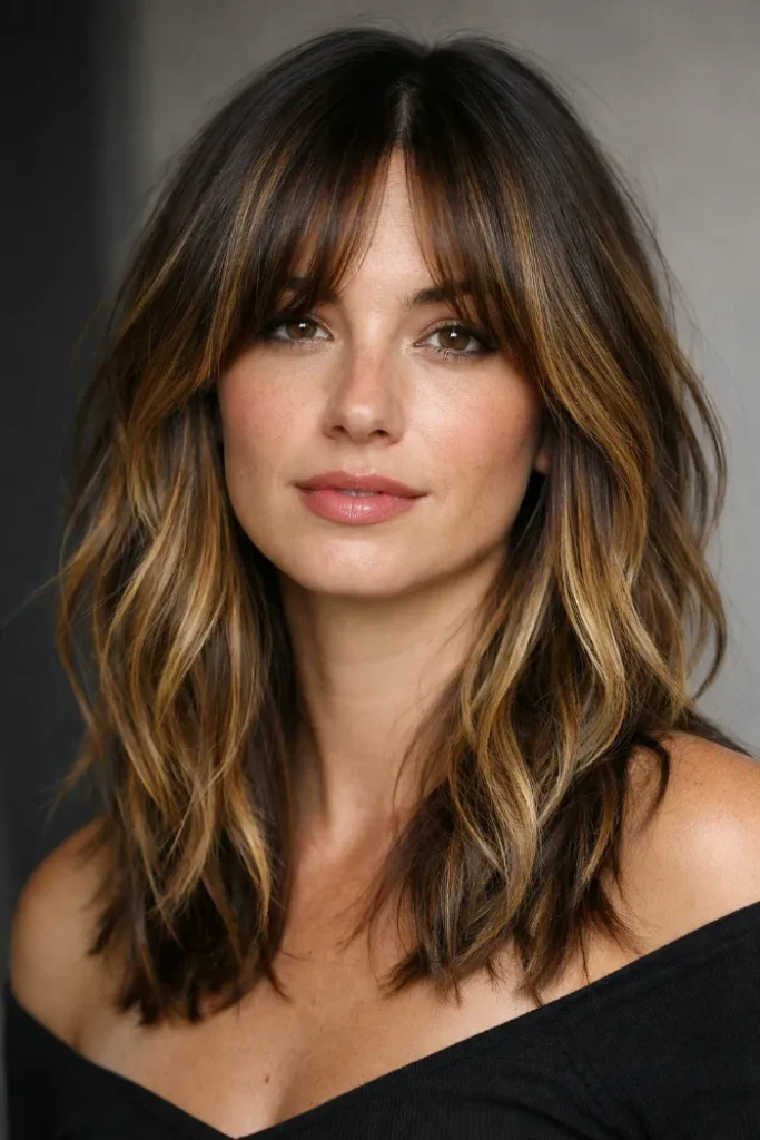 Soft, wispy bangs give this balayage a relaxed, approachable feel.
