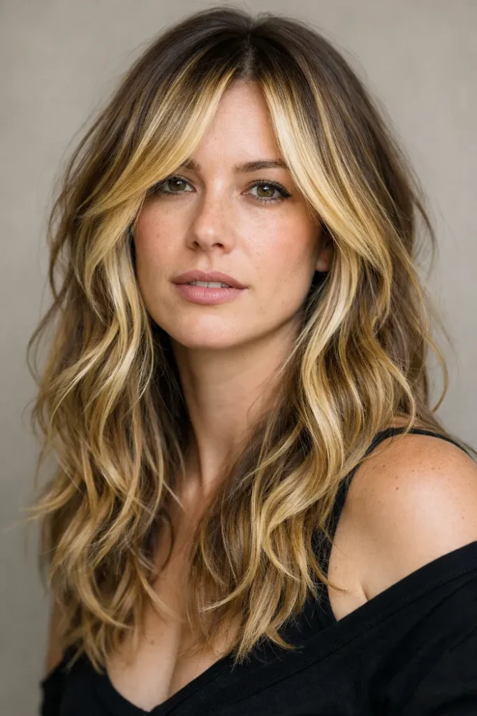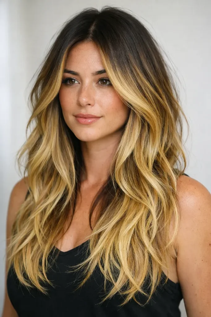 Long layers give this balayage room to move, while golden blonde tones add warmth through the lengths.